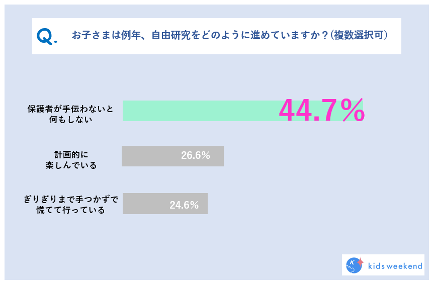 一方、そうした保護者の想いに対して当事者の子ども側では、「お子さまは例年、自由研究をどのように進めていますか?」という問いに「保護者が手伝わないと何もしない(44.7%)」という回答が最多となりました。2位は26.6%の「計画的に楽しんでいる」という意見も聞かれつつ、「ぎりぎりまで手つかずで慌てて行っている」との回答が24.6%、自由回答でも「楽しんでいるが計画的には難しい」や「楽しむけれど親のタイムマネジメント等の導きも必要」という意見も上がり、長い夏休みに計画的に進めるということもひとつの課題のようです。とは言え、保護者のサポートをうけつつ自由研究に着手すれば、多くの子どもたちが楽しく進められることもわかりました。