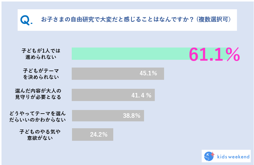お子さまの自由研究で保護者が大変だと感じることの1位は「子どもが1人で進められない(61.1%)」がもっとも多く、次いで45.1%が「子どもがテーマを決められない」、41.4%が「選んだ内容が大人の見守りが必要となる」という回答となりました。上位3位までに共通しているのが、自由研究に保護者のサポートが相当数必要である事実です。また、38.8%が「どうやってテーマを選んだらいいのかわからない」、24.2%が「子どものやる気や意欲がない」とも回答しており、着手の前段階にも課題があることがわかりました。少数派では「一緒に考えたりアイデアを出し合う時間を確保することが大変」との意見や、「下の子どもたちの世話があり充分なサポートができない」という意見もあり、忙しい保護者たちにとっては、意義のある研究にするための協力する時間の捻出に悩む姿も推察されます。