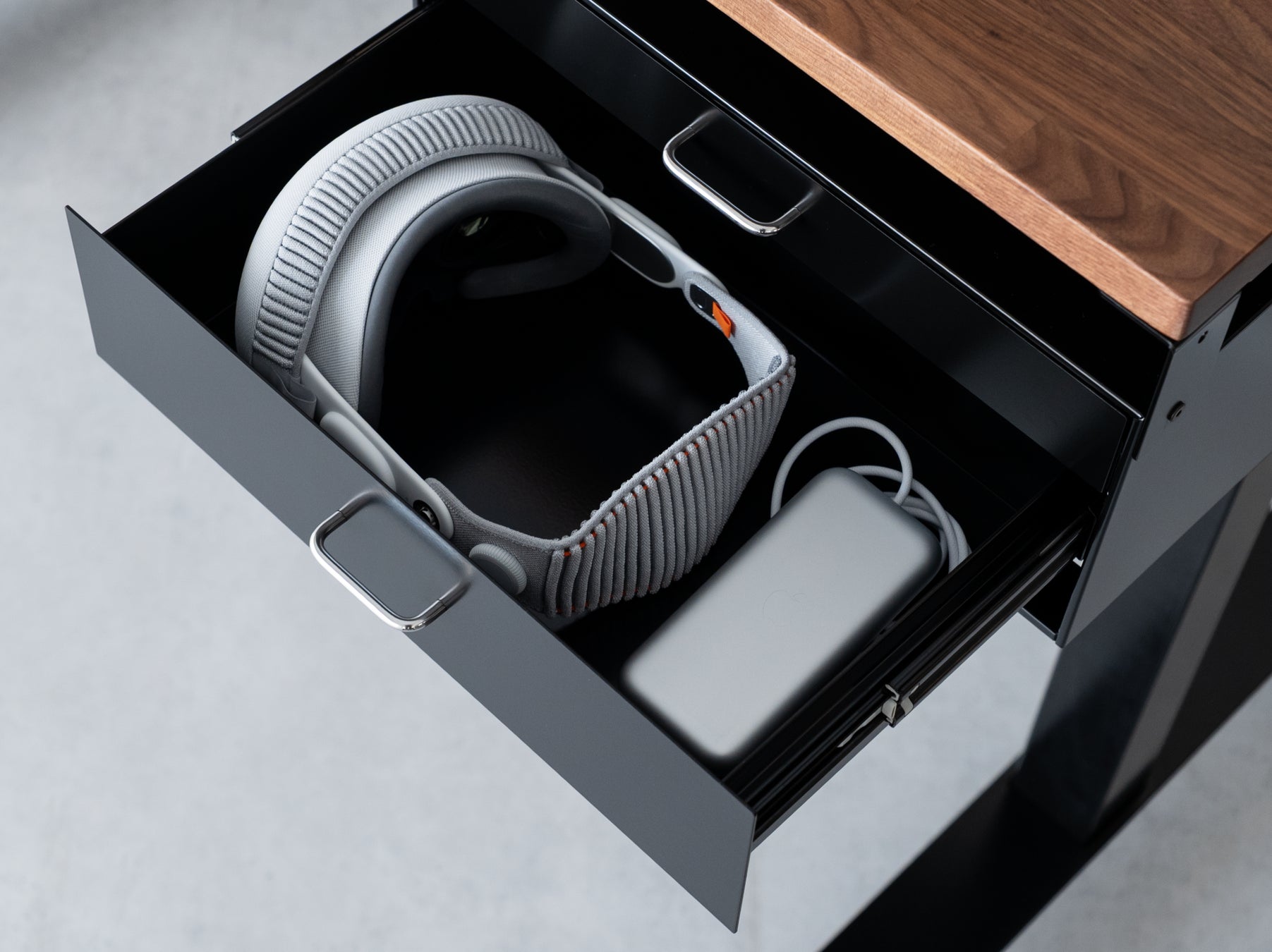 深型の引き出しは、通常デスク周りで置き場に困る高さのあるアイテムや大型のガジェット等も収納可能。例えばApple Vision Proの場合、本体はもちろんケース、バンド、ライトシーリングといった周辺機器もきれいに収納できます。