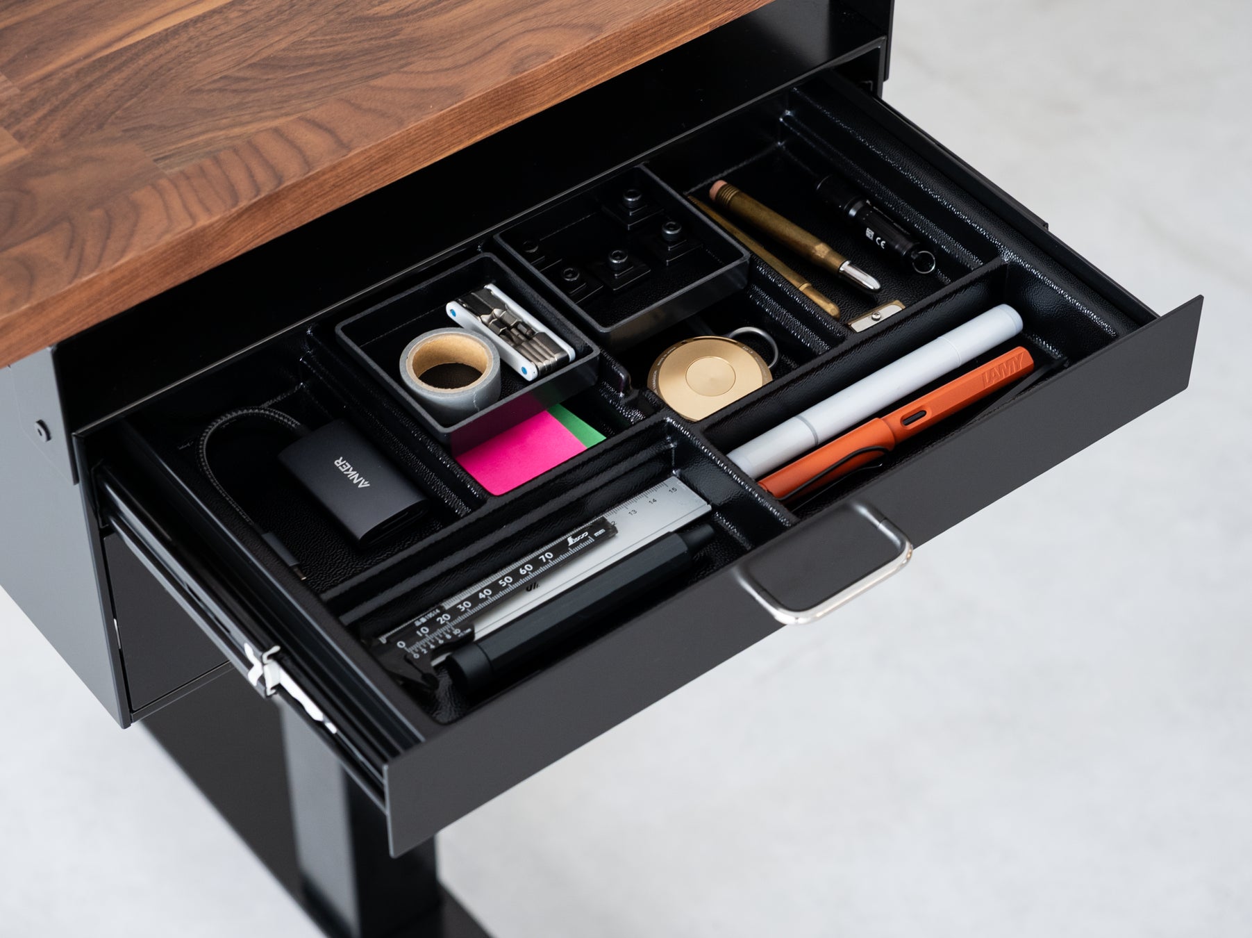 浅型の引き出しは、デスク周りに散らばるさまざまな小物や文具の収納にマッチします。別売りの『Drawer Inner Tray』を活用することで、引き出し内部をより便利に利用できます。