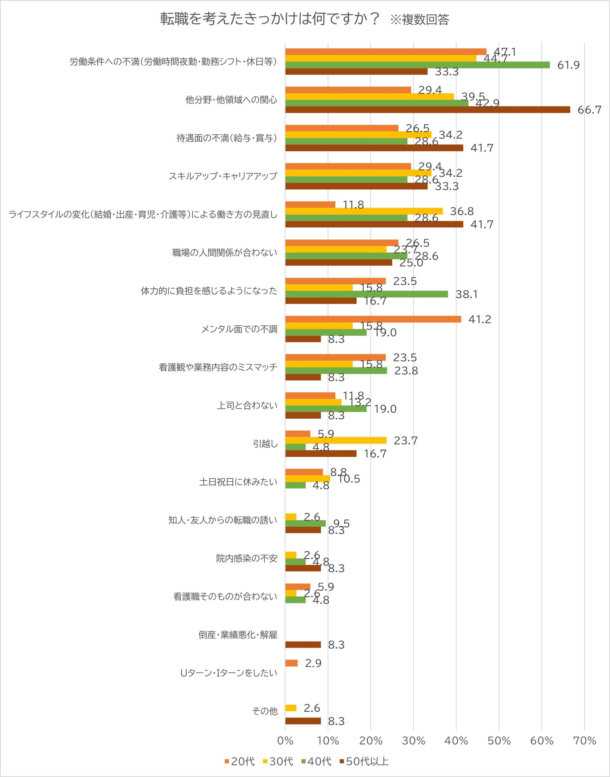 転職のきっかけは必ずしもネガティブ要素だけではなく、年代によるものやライフスタイルの変化により影響もある。年代特有で比率が高いのは、20代「メンタル面での不調」41.2%、30代「引っ越し」23.7%、40代「体力的に負担を感じるようになった」38.1%・「労働条件への不満」61.9%、50代「他分野・他領域への関心」66.7%等。