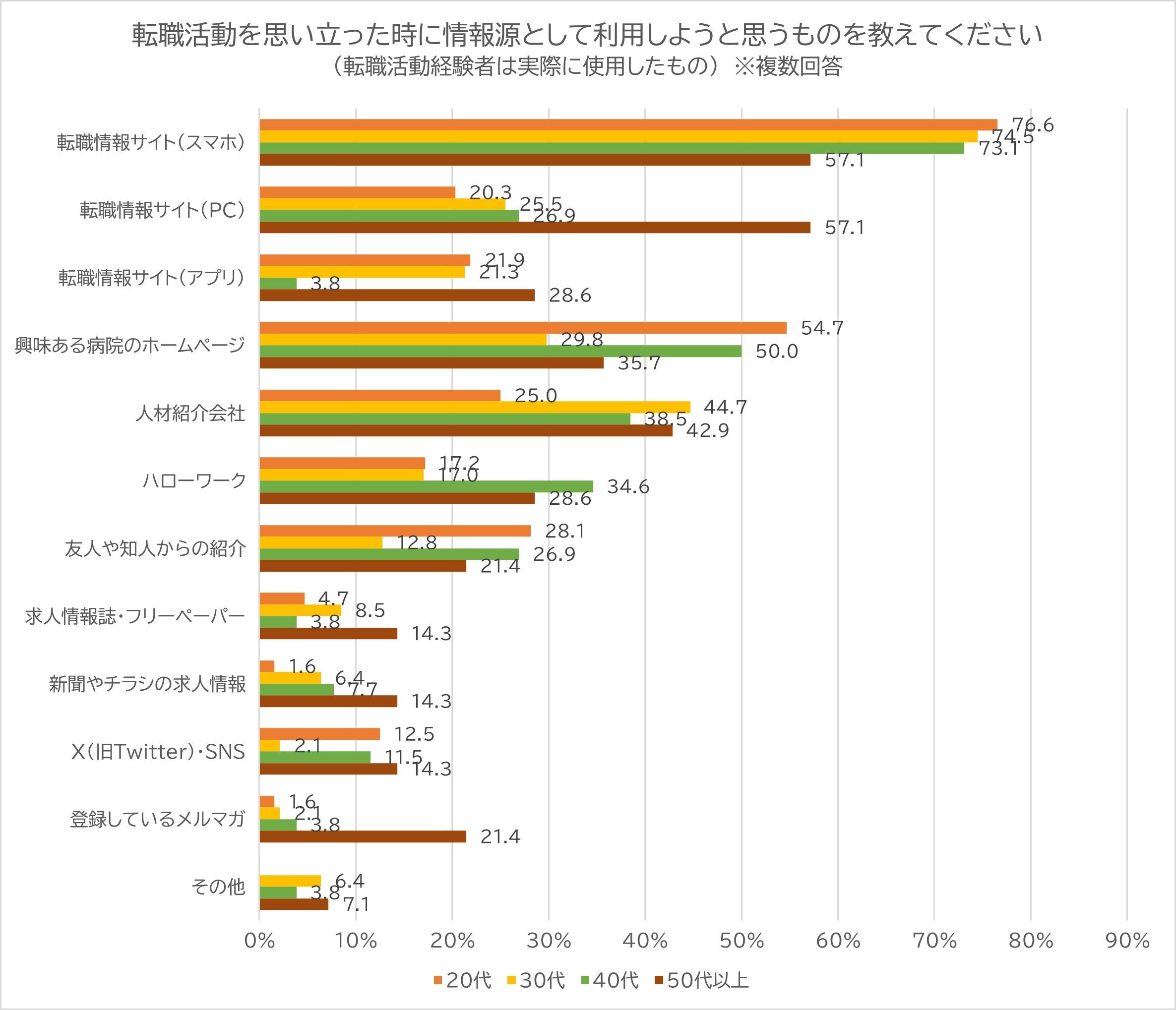 年代を問わず全体的な傾向としては、「転職情報サイト(スマホ)」、「興味ある病院のHP」が目立つ。50代以上はスマホ派とPC派に二分となっている。30代以上は「人材紹介」も4割程度が活用している。ライフスタイルの変化等で多忙と思われる30代は、スマホで情報収集し、人材紹介に登録というパターンが見て取れる。