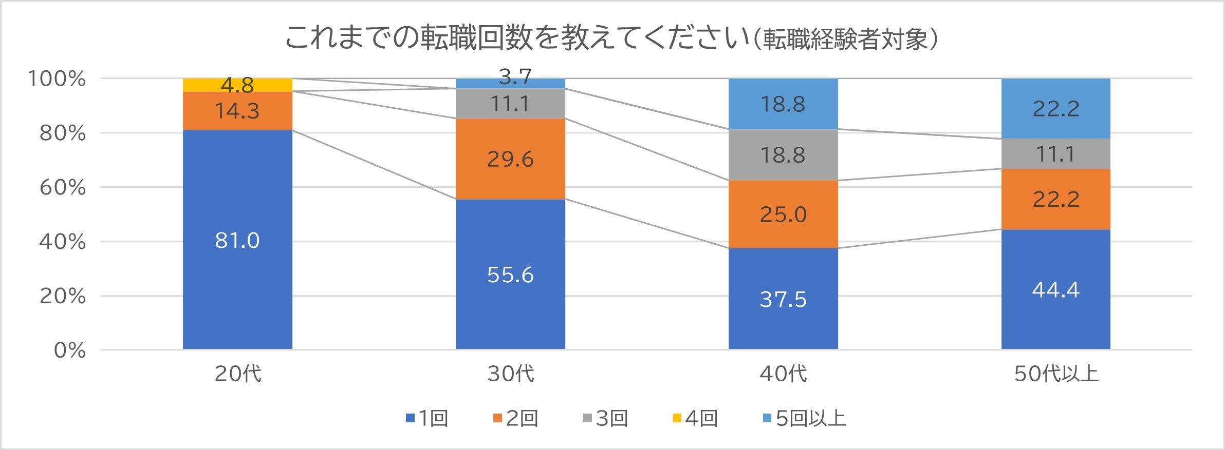 転職経験者に行った調査では、2回以上の転職経験者もかなり多く、20代:19.1%、30代:44.4%、40代:62.5%、50代以上:55.6%となっている。
