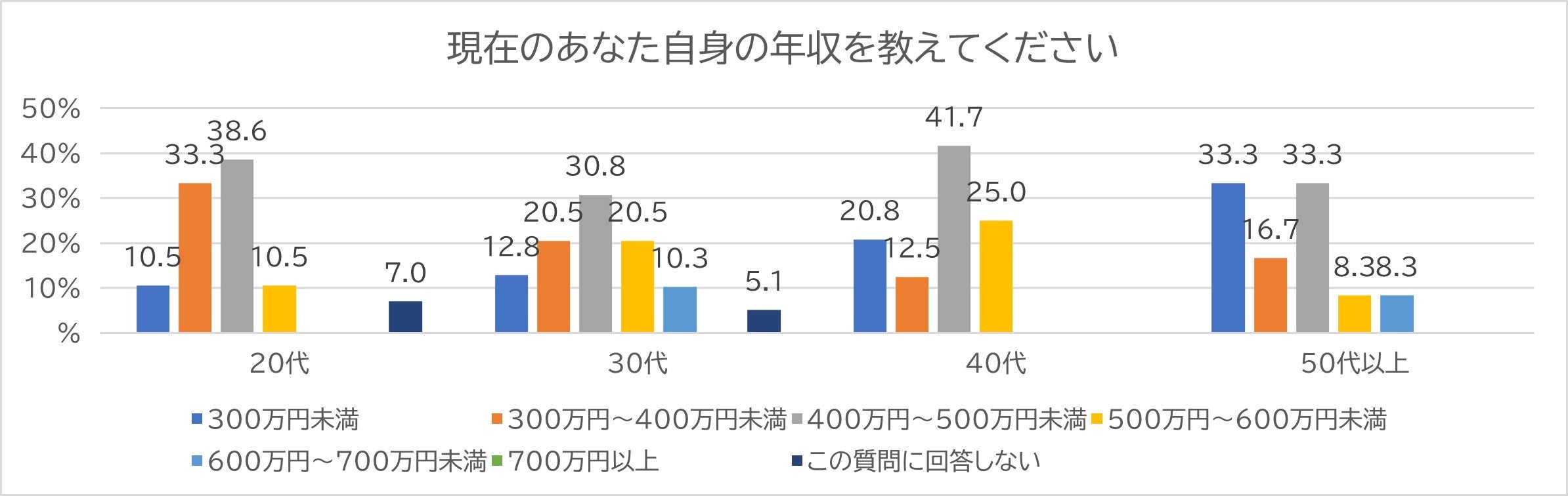 それぞれの年代トップが「400万円~500万円未満」となった。40代~50代以上に関しては、働き方の多様性があるためか、「300万円未満」と「400万円~500万円」の山が目立った。