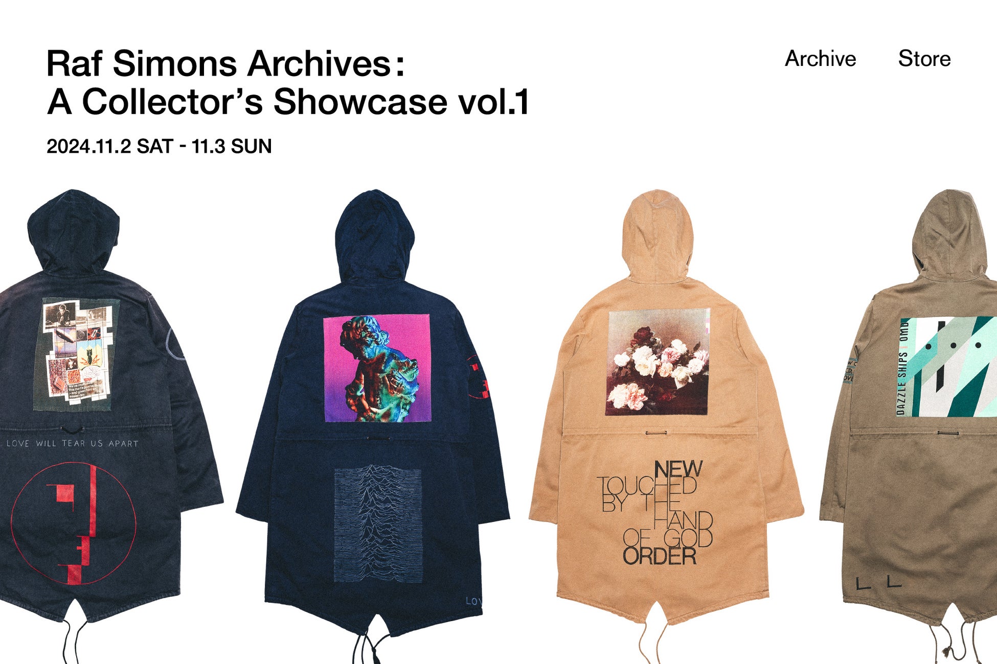 デザイナーたちが残した過去の名作を扱うセレクトショップ「Archive Store」(店舗:東京都渋谷区、代表取締役:齋藤賢吾)のギャラリースペース内にて、2024年11月2日(土)と11月3日(日)の2日間、ラフ・シモンズのアーカイブコレクターによって収集された名作アーカイブ約50点の展示・販売を行うポップアップイベント「Raf Simons Archives : A Collector’s Showcase vol.1」を期間限定で開催いたします。