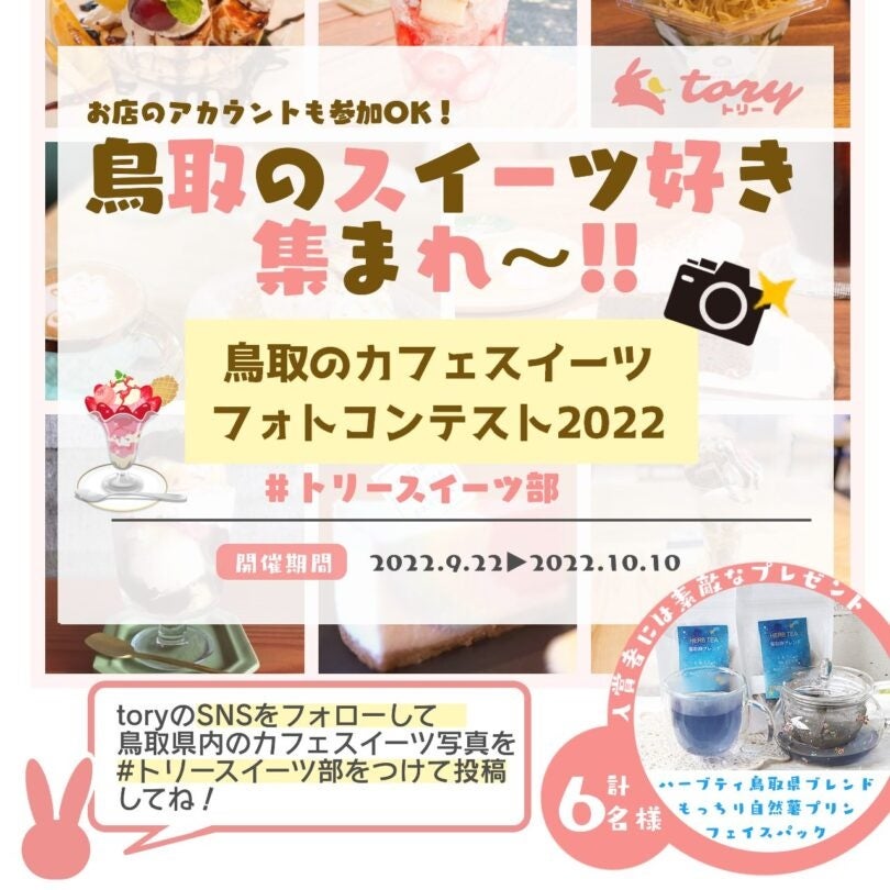 toryでは鳥取スイーツを広めるため、「鳥取県内のカフェで提供されるスイーツ写真」を募集します。