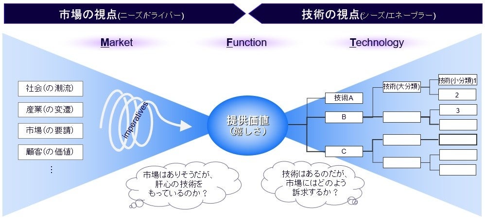 提供価値により「市場」と「技術」を結びつけることで潜在市場、技術課題を明確化