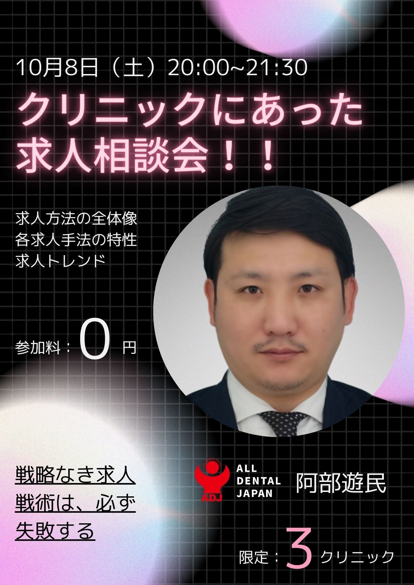 株式会社オール・デンタル・ジャパン(本社:東京都台東区柳橋2-5-6、代表取締役:木下英明、廣田祥司)は、10/8(土)20:00~21:30にて求人相談会を開催いたします。3クリニック限定で各クリニックに寄り添った相談会となります。完全無料ですので、お早めにお申し込みください。