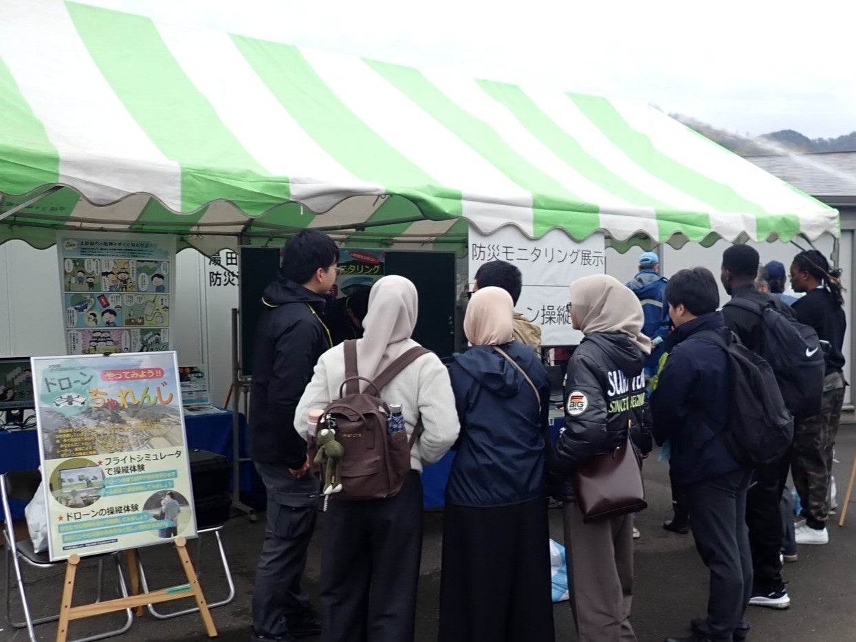 展示ブースでは、中央開発㈱のジオ・メンテナンス事業部・東北支店による住民参加型の斜面防災モニタリングやドローンを用いた地形調査についての紹介のほか、災害調査や医療物資運搬等の利活用が期待されるドローンについて理解を深める目的で、山形大学によるドローンのシミュレーター・実機による操縦体験などが実施されました。実機を用いた操縦体験コーナーでは、ドローンに搭載したサーモセンサーによる撮影の実演に注目が集まり、子供から大人まで大勢の方に操縦体験をしていただきました。