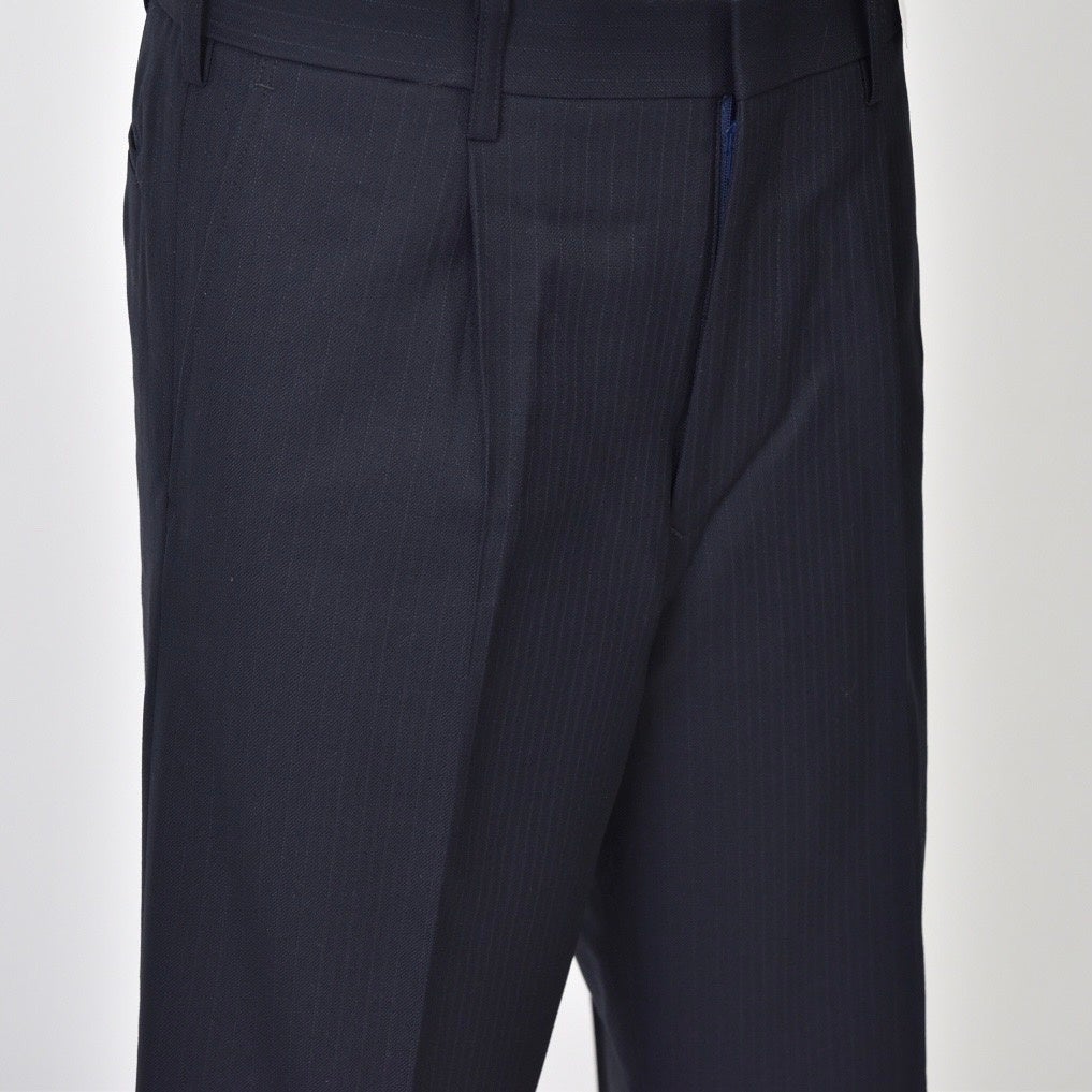 濃紺を基調に、一見すると無地調の「シャドーストライプ」を織り込んだオリジナル柄です。スマートなワンタック入りストレートシルエットで、性別に関係なく着やすいスタイルです。