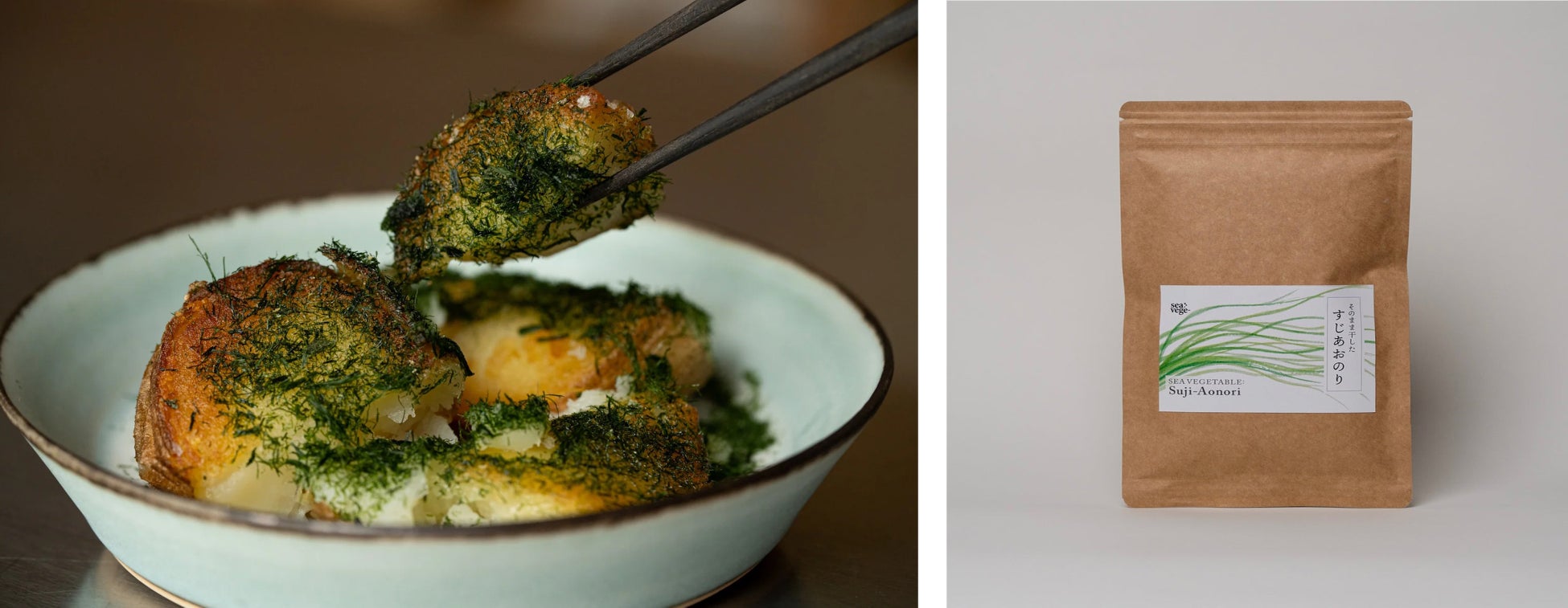 当社は、小売商品の他に、飲食店やホテル向けの業務用販売を行っています。各地に根付く美味しい海藻の食文化を残したいという思いから、すじ青のりをはじめ、天然採取が難しくなった海藻を取り扱っております。地上の植物は探求し尽くされ、様々な栽培技術や調理方法が確立していますが、海藻の世界はまだはじまってすらいないものばかりです。過去から受け継がれる食文化を守ると同時に、新たな海藻食文化をつくることで、海にも人にも良い未来が広がっていると信じて、私たちは日々活動しています。