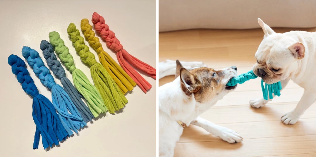 廃棄されるはずの「布ミミ」をアップサイクルした紐を使用したインテリア雑貨シリーズです。 極太の糸 として生まれ変わる生地を使用してカゴとワンちゃん用おもちゃを作成。製品は1つ1つ手編みによって編まれていますので形や感触も一つ一つ違いがあり いつも同じ色が揃わないのもアップサイクルした紐ならではの良さになります。