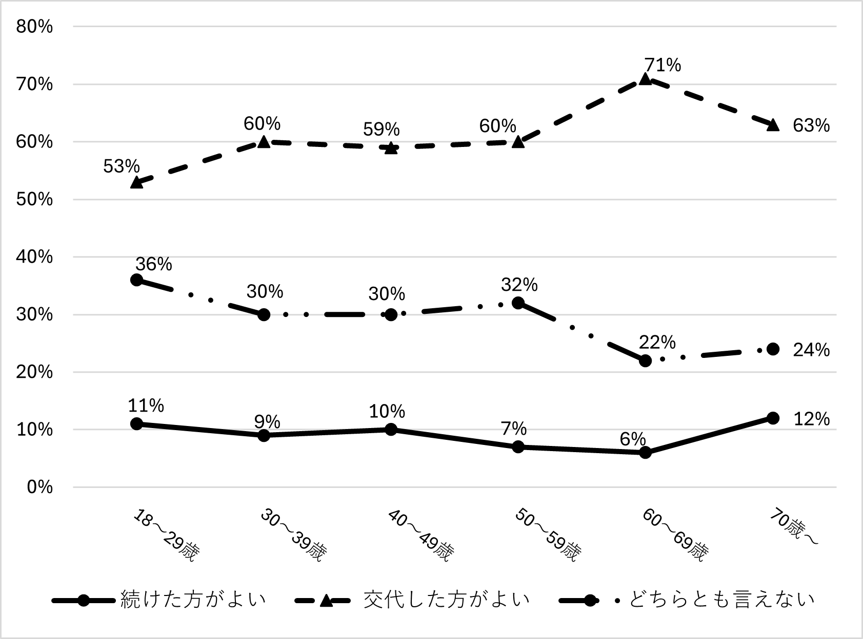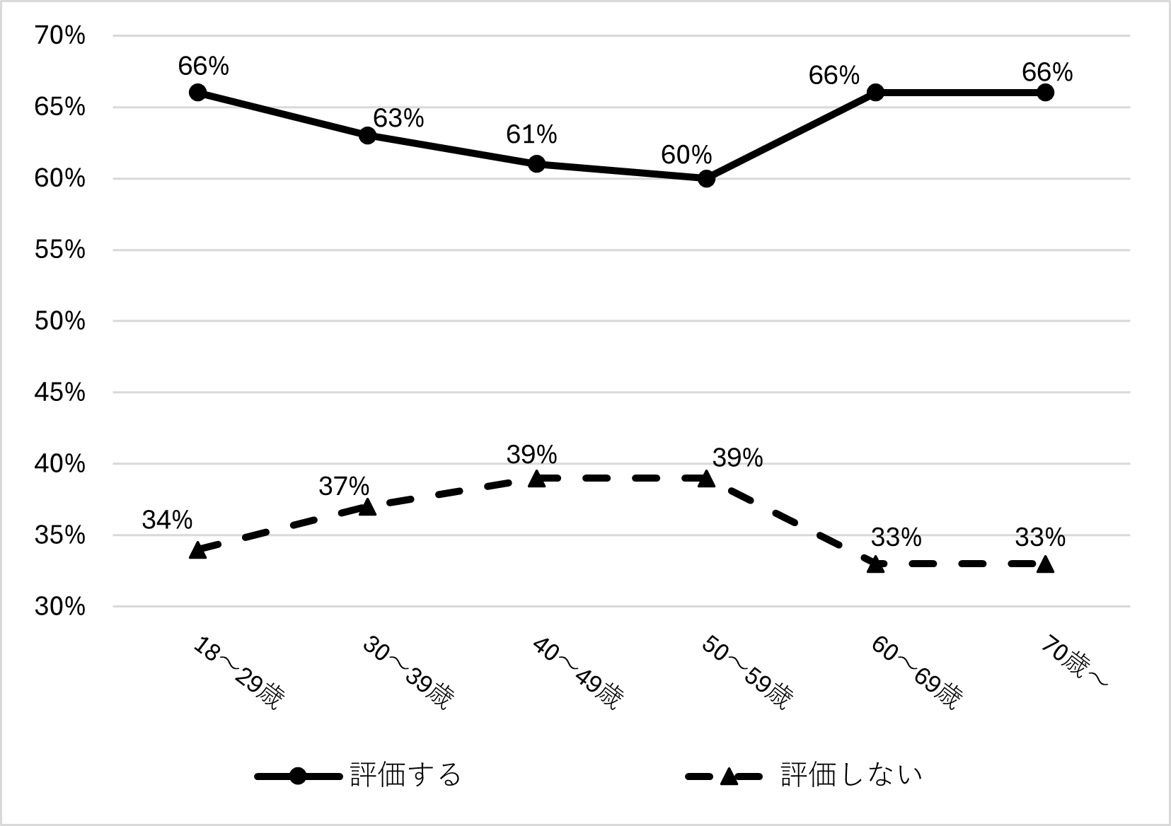 どちらも、物価高関連対策という目的は同じですが、評価は大きく分かれました。定額減税については、政策効果の判断を求めたからかもしれません。政策の効果は期待できなくても、補助や支給など享受できるものは受け入れるということなのでしょうか。いずれにせよ、〔図2〕の年齢差のないグラフの形状からすると、現物支給的な対応の、有権者対策としての相応の効能が示唆されます。