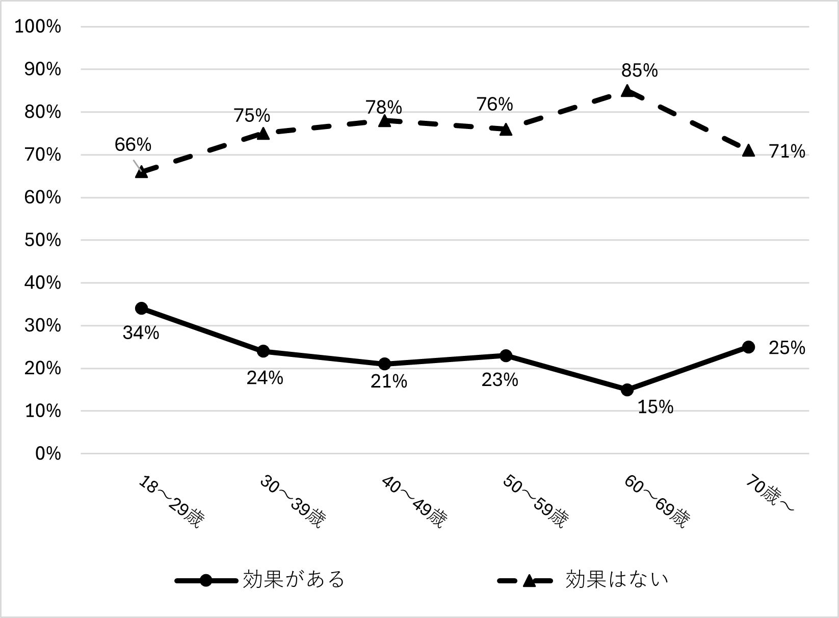 次に、6月から実施された定額減税については、「定額減税は物価対策として効果があると思いますか」と聞きました。結果は、「大いに効果がある」が3%、「ある程度効果はある」が21%、「あまり効果はない」が50%、「全く効果はない」が25%と、否定的評価が大多数になりました。こちらも、年齢別の結果を〔図3〕にまとめました。60代の85%を最高に「効果なし」が圧倒的多数を占めています。