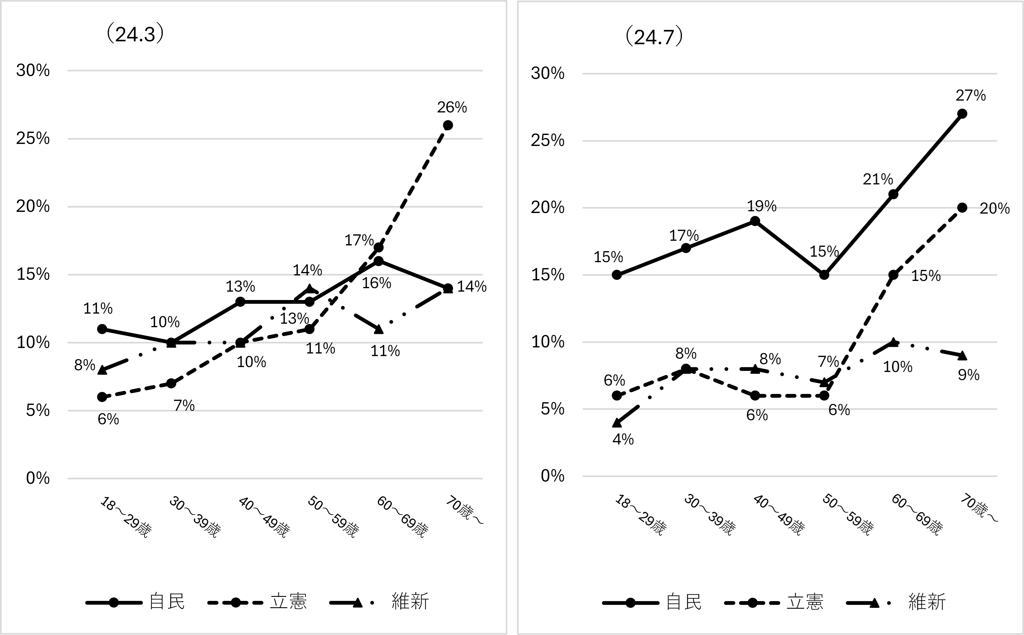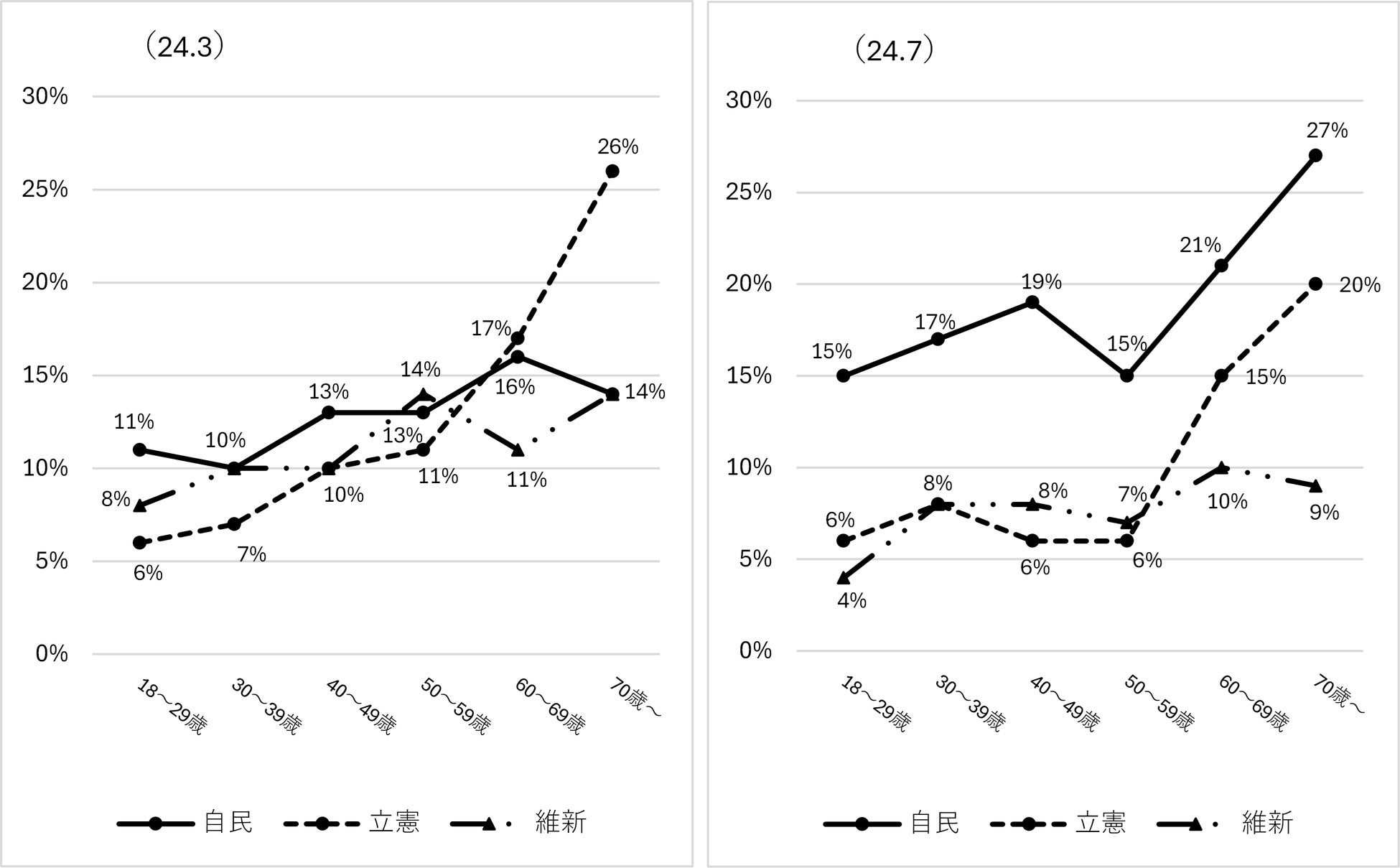 ■次期衆院選の投票意向:立憲民主が急落し、自民が全年代でリード