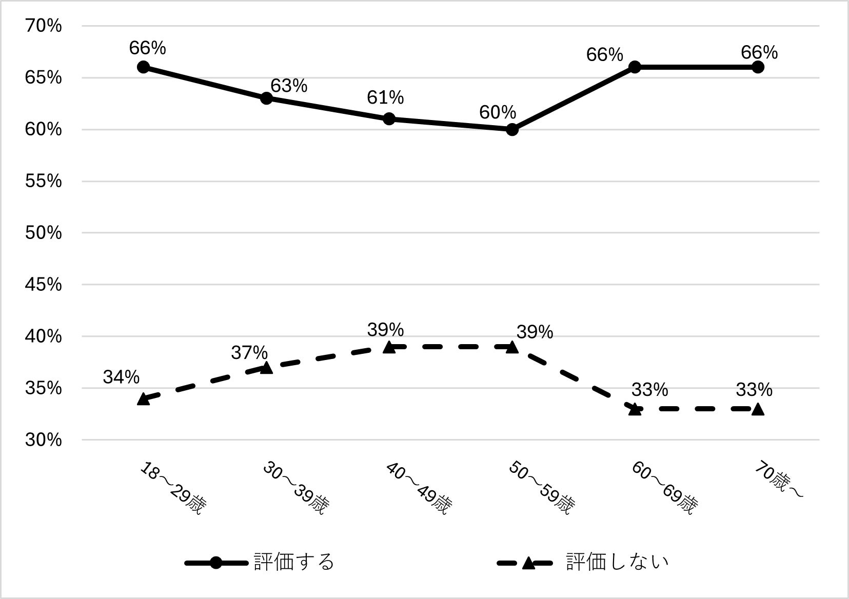 今月の調査では、岸田政権の経済対策に関する評価を聞きました。先ず、電気・ガス代の補助については、岸田首相が8月から3か月限定で再開する方針を表明しました。この方針に対しては、「大いに評価する」が16%、「ある程度評価する」が48%、「あまり評価しなし」が24%、「全く評価しない」が12%で、肯定的な評価が多数を占めました。〔図2〕は、年齢別の結果です。すべての年代で「評価する」が6割以上という共通傾向が確認できます。