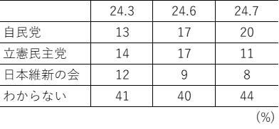 9月の自民党総裁選後には、解散・総選挙がうわさされています。dサーベイ世論調査では、「今、衆議院選挙が行われたら、比例代表でどの政党に投票しますか」を聞いています。7月調査の結果は、自民党が6月からプラス3ポイントの20%、立憲民主党がマイナス6ポイントの11%となり、両党の差が大きくなりました。立民の急落は、東京都知事選における蓮舫候補の劣敗の影響でしょうか。〔表2〕に3月からの推移をまとめました。自民、立民、維新の三つ巴(24.3)→自民、立民の二党対決(24.6)→自民の一党優位(24.7)と、構図は目まぐるしく変わっています。