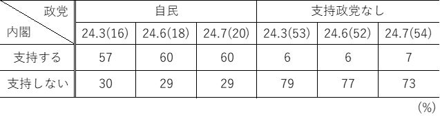 支持政党別の内閣支持率に関しても、自民党支持者(全体で20%)でこそ60%を確保していますが、多数派の支持政党なし層(同54%)における支持率は7%と、非常に厳しい評価が続いています(〔表1〕をご参照ください)。小康状態といったところでしょうか。