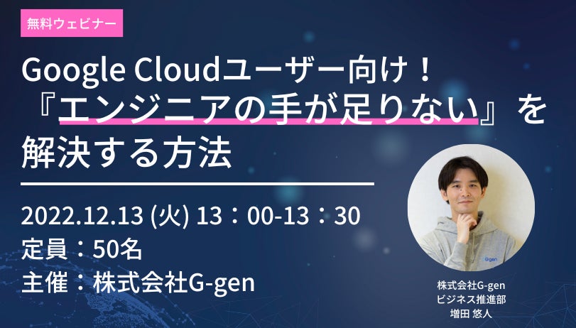 株式会社G-gen(本社:東京都新宿区、代表取締役:羽柴孝)は、無料ウェビナー「Google Cloudユーザー向け!『エンジニアの手が足りない』を解決する方法」を12月13日(火)13時より実施いたします。