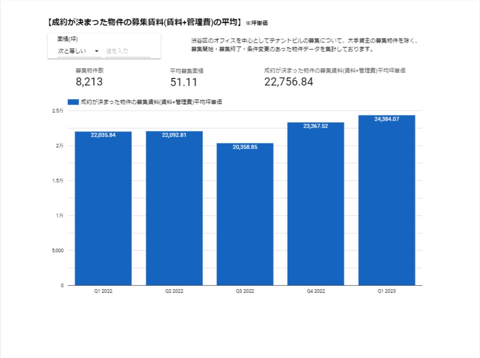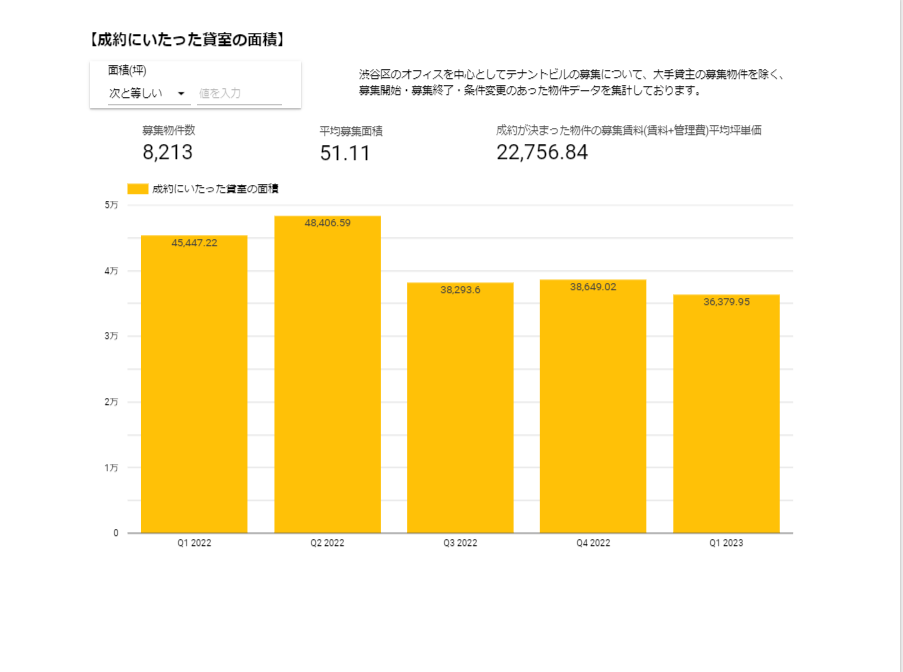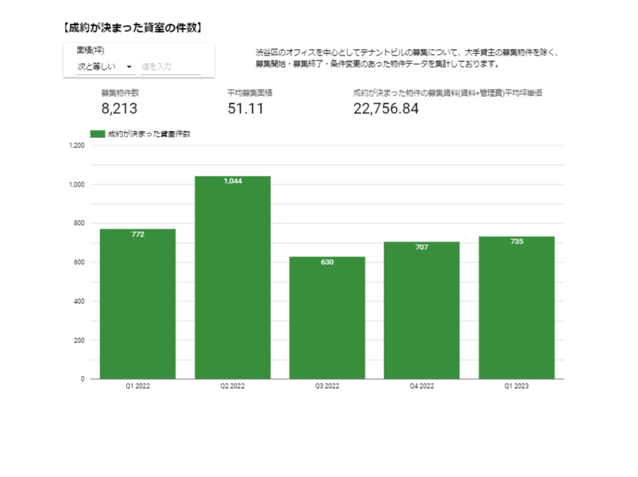 2023年第1四半期の成約面積は、36,379坪と前第1四半期を大きく下回る状況で、小規模の区画の成約が比較的多かったことが影響していると思われます。