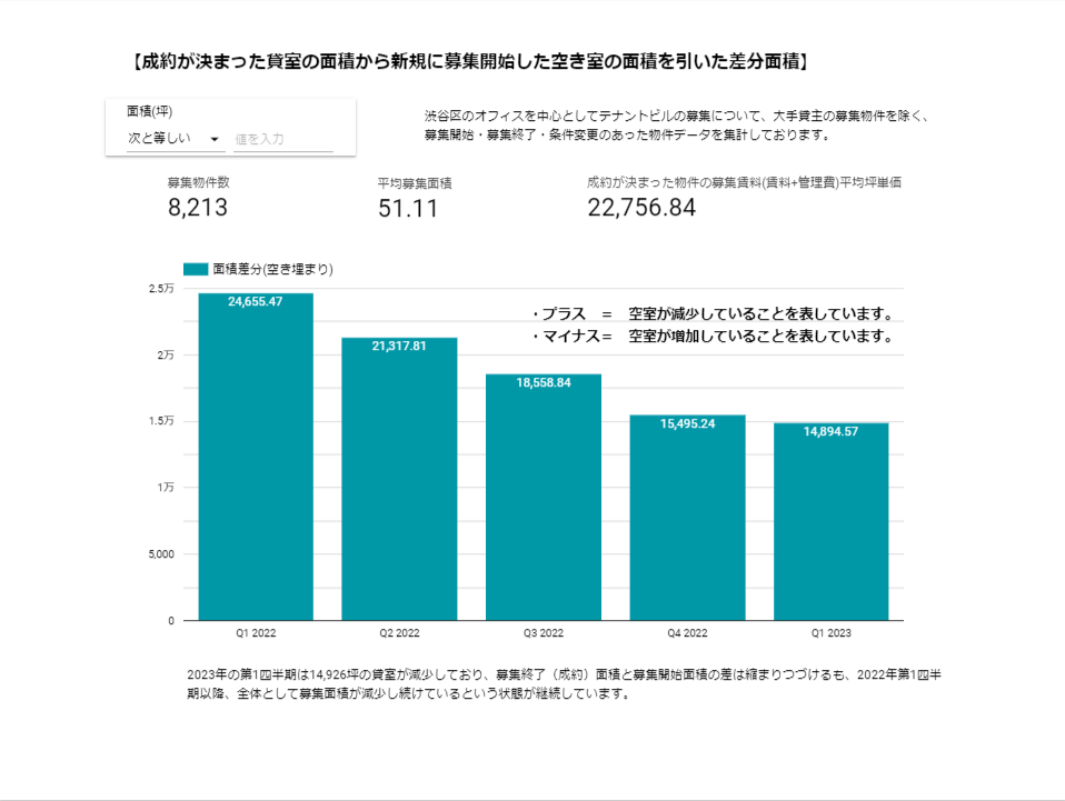 下のグラフは、成約が決まった貸室の面積と新規に募集開始した空き室面積の差分面積を表現しています。渋谷区に関しては、段階的に差が縮まっているもののどの期間も成約物件面積が空き室面積を上回っており、市場全体として空き室の面積が減少していることがうかがえますが、その幅は減ってきています。