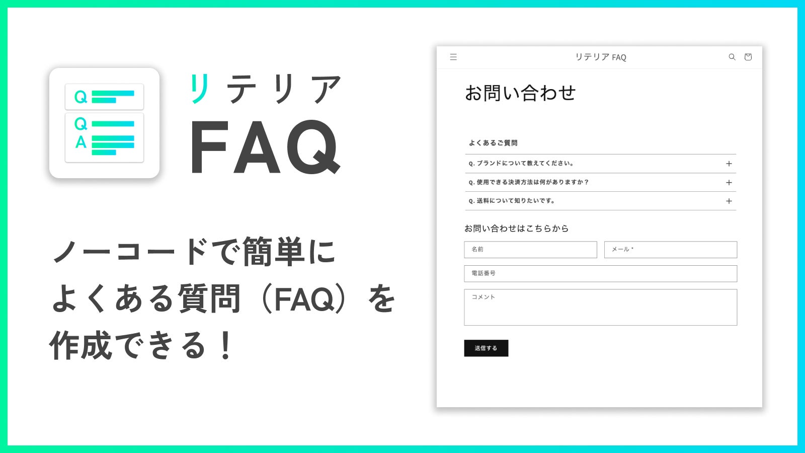「よくある質問どこでも挿入|リテリア FAQ」は、ShopifyのテーマにFAQ(よくある質問)表示するためのセクションを導入できるアプリです。アコーディオン式(開閉式)のFAQをノーコードで簡単に追加することができます。