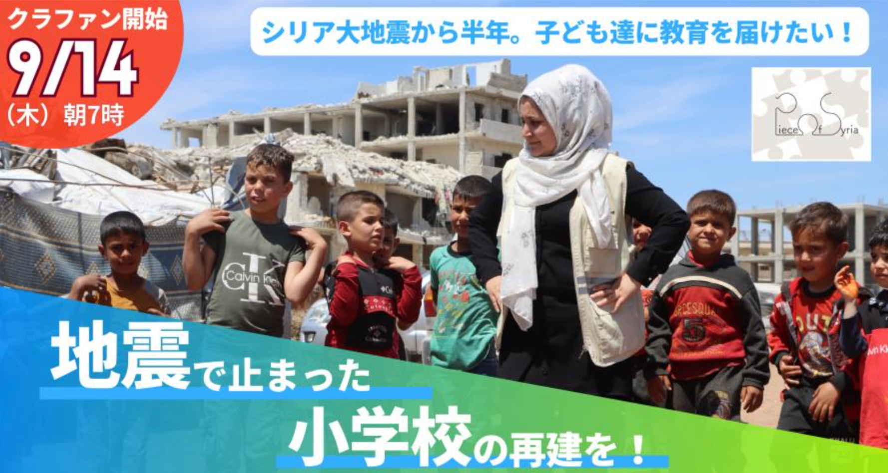 シリア大地震で被害を受けた小学校を再建し、400人の子どもたちに教育を届ける。NPO法人Piece of Syria、750万円を目標にしたクラウドファンディングを10月31日まで実施中。