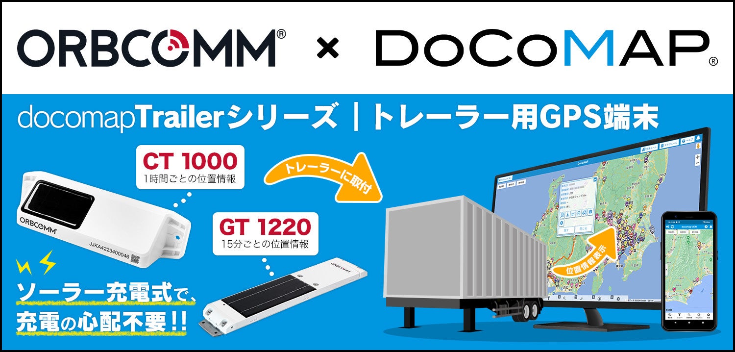 株式会社ドコマップジャパン(本社:東京都港区、代表取締役:浦嶋一裕、以下 ドコマップジャパン)は、オーブコムジャパン株式会社(本社:東京都千代田区、代表取締役:シャルマ・スニール、以下 オーブコムジャパン)を通じて、グローバルIoTソリューションプロバイダーであるORBCOMM製のGPS端末「GT 1220※1」「CT 1000※2」をドコマップジャパンの「docomapTrailer※3(ドコマップトレーラ)」の対応端末として新たに導入し、提供を開始いたします。
