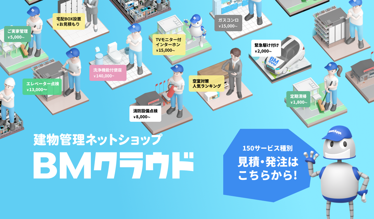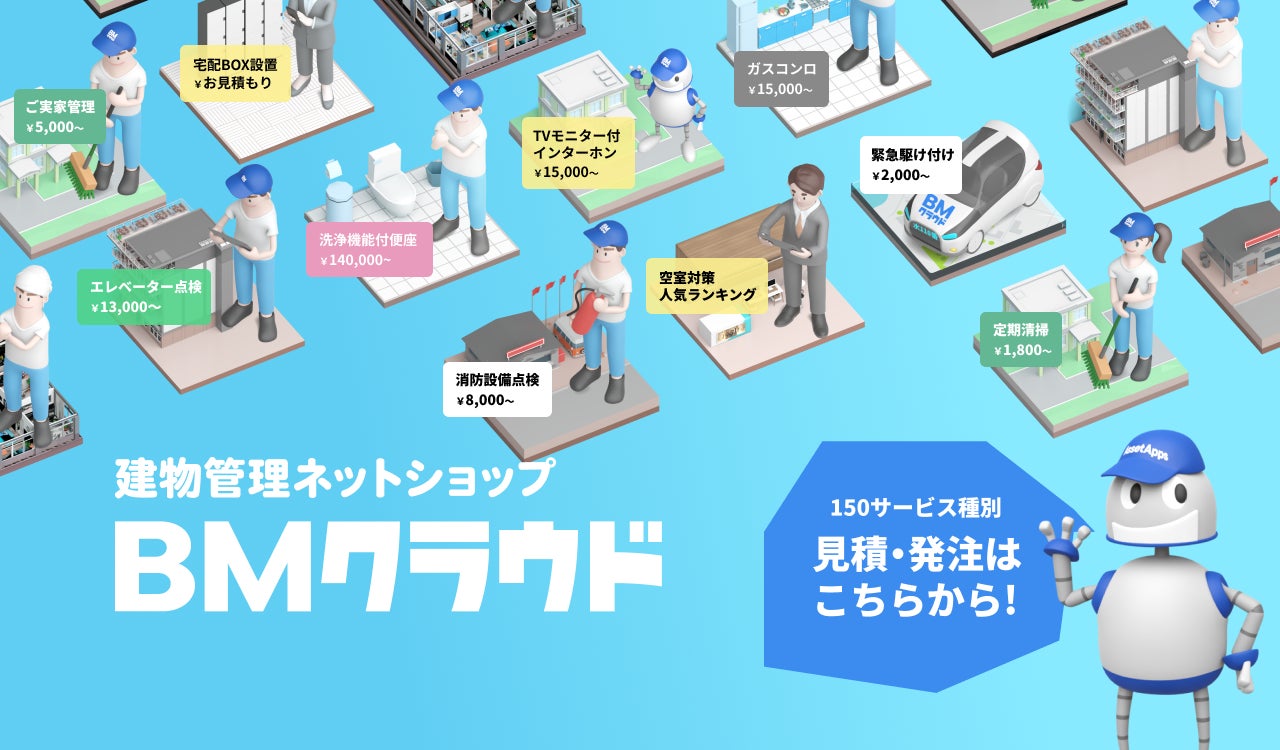 BMクラウドは、オンライン上で簡単に、賃貸経営に欠かせない建物管理サービス(清掃・点検・原状回復・緊急駆付・ビルメンテナンスなど)の見積・発注が可能なシステムです。