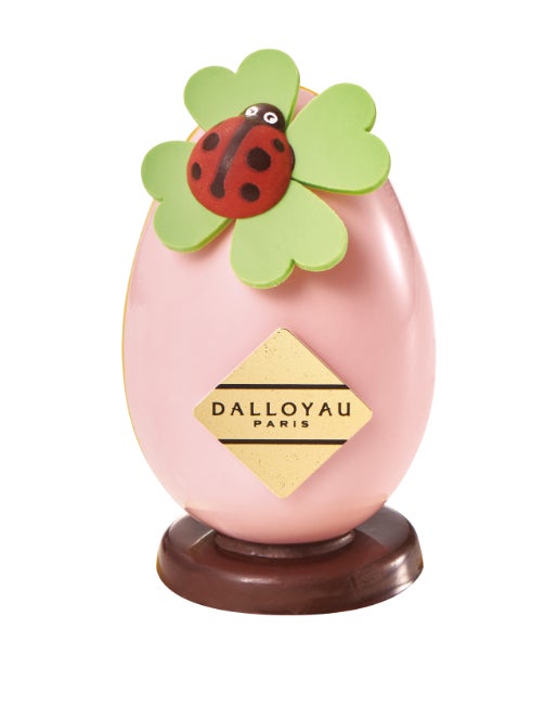 ピンクと黄色に色付けしたホワイトチョコレートで卵型に仕立てたショコラ。中を割るとフリチュール(海の生き物の形をしたショコラ)が2個出てくる仕掛けが!クローバーにとまった幸せの象徴「てんとう虫」が春の訪れを告げる、かわいらしい一品。