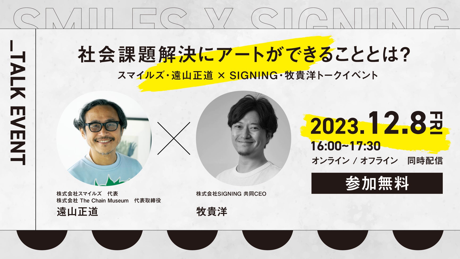 株式会社SIGNING(サイニング、本社:東京都港区、代表取締役社長:亀山淳史郎、以下SIGNING)は、株式会社スマイルズ代表・遠山正道様をゲストにお招きし、「社会課題解決にアートができることとは?」をテーマにしたトークセッションを、Social Issue Gallery「SIGNAL」にて12月8日(金)に開催します。