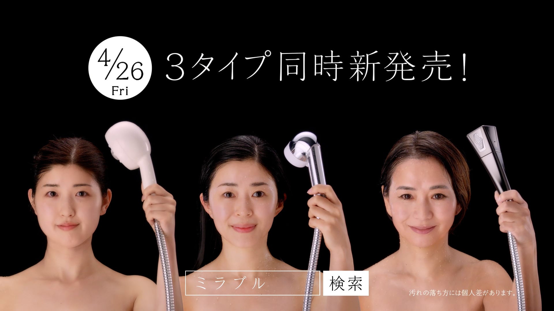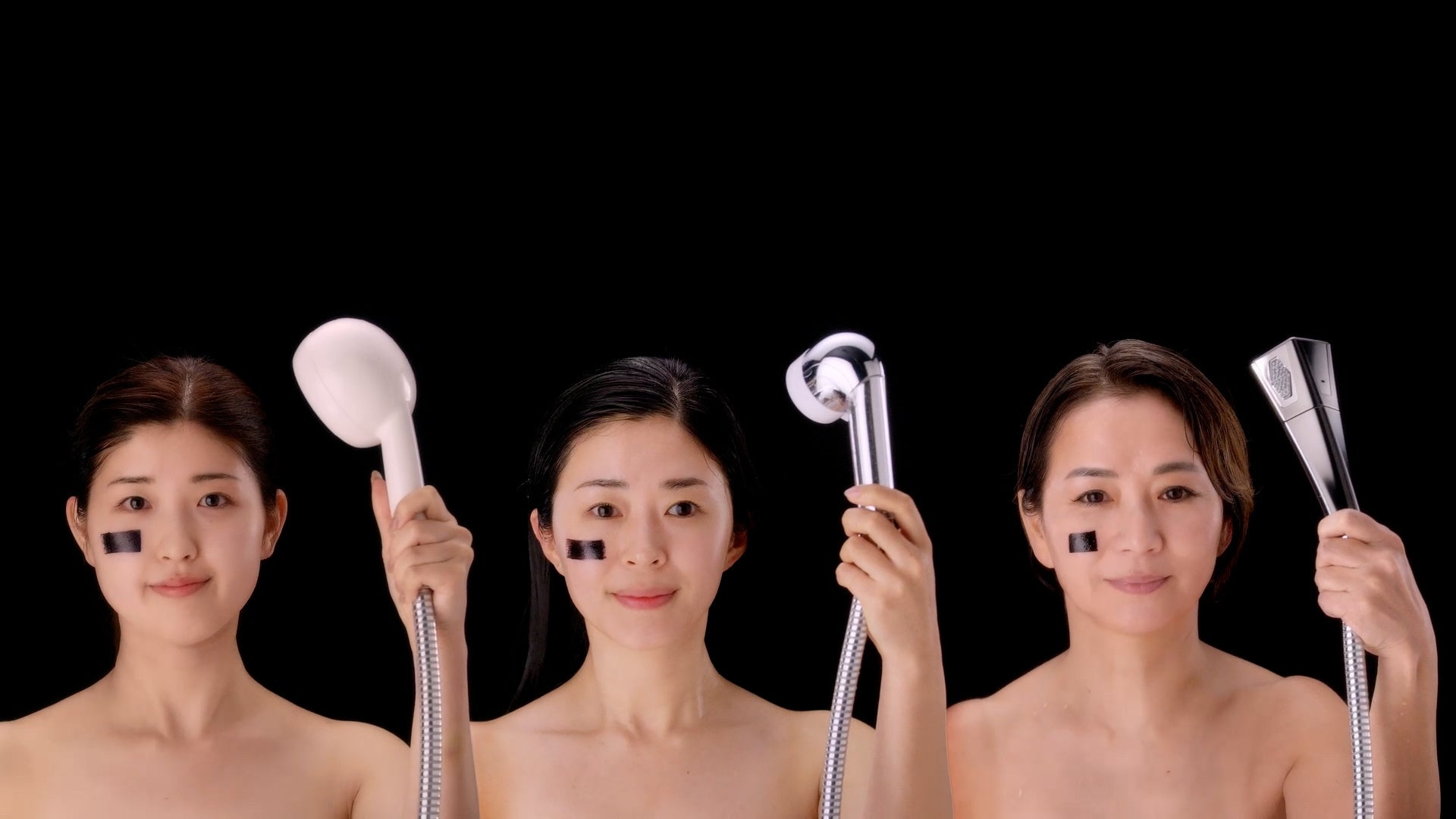 年齢ごとの肌悩みに応じた独自の水流をお楽しみいただけるよう、見た目や吐出口の形状もこだわった3タイプのシャワーヘッドの違いが際立つCMとなっています。