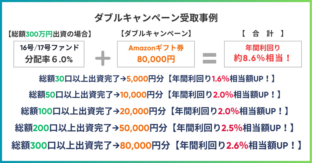 16号と17号の合算出資額が300万円以上の場合、最大で80,000円分のギフト券がもれなくゲットできます!