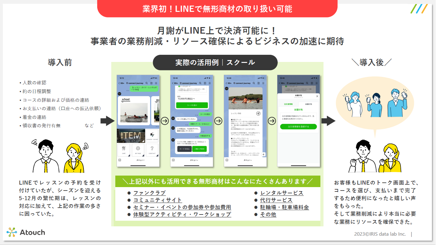 2020年から政府、官公庁、自治体向けにLINE社として連携し、コロナ対策のLINE公式アカウントを現在進行系で数多く対応してまいりました。2023年からは、日本の経済活性化・より元気にしていくため、官民問わず全領域で活用できるLINEを活用し、LINEのトーク画面上で決済まで完結できるショップ「Atouch」の提供を行っています。