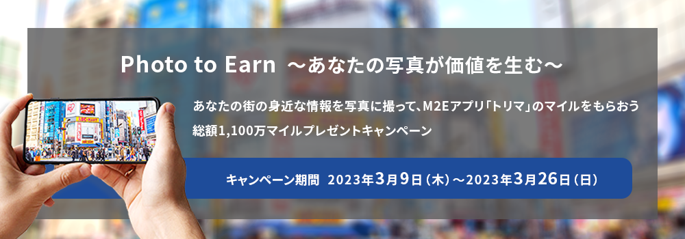 「地球を喜びで満たそう」をミッションに掲げるESGメタバースカンパニーのジオテクノロジーズ株式会社(本社:東京都文京区、代表取締役社長 CEO:杉原 博茂、以下「ジオテクノロジーズ」)は、この度、M2Eアプリ「トリマ」のユーザーに向け、街の情報を写真投稿することで合計1,100万マイルがもらえるお得なキャンペーンを、本日より開催いたします。