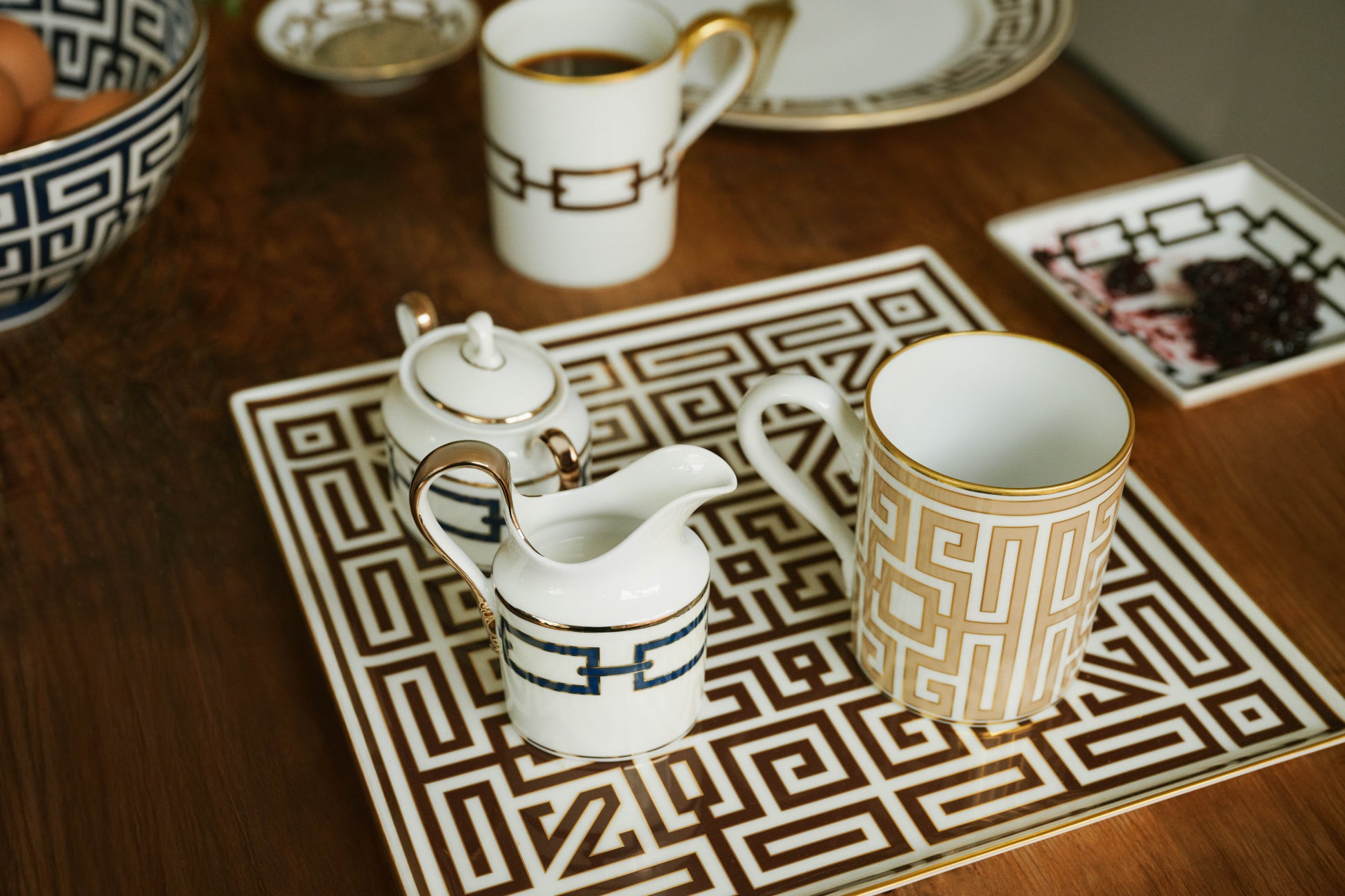 あらゆるシーンで、ジェイクはカテーネとラビリントの魅力的な優雅さに包まれます。これら2つの象徴的なコレクションは、もともとジオ・ポンティがメゾン向けにデザインしたものです。新たなカラー「エーバノ」と「カシミア」、そして「ネーロ」と「サファイア」のアクセントが、パターンが持つグラフィックな力強さに新たな鮮やかさ、つまり洗練された現代的な表情をもたらし、ジノリ1735のデザインを日常へと導きます。