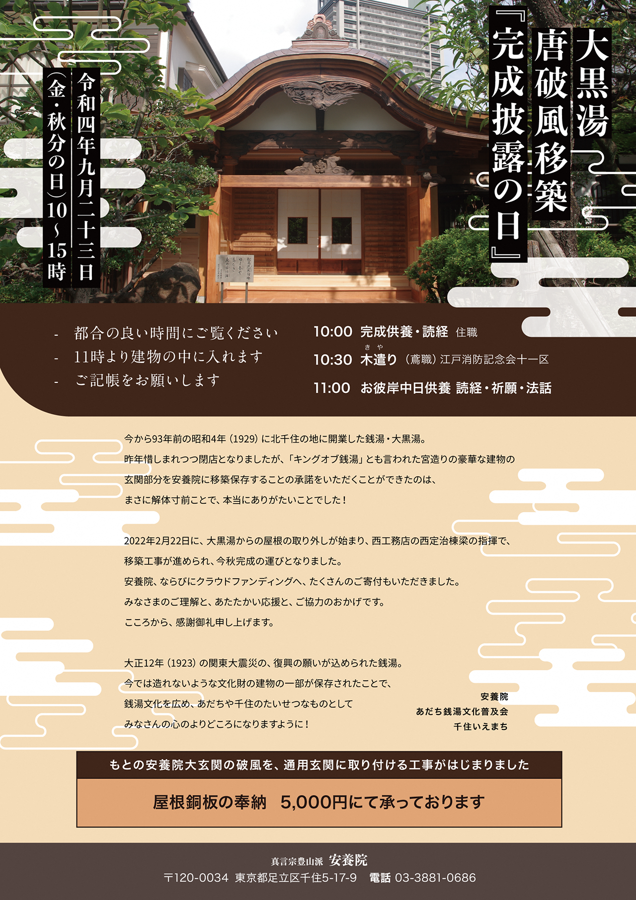 令和3年6月30日、「キングオブ銭湯」と呼ばれ全国的にも有名だった大黒湯(足立区千住寿町)が閉店しました。千住の古刹「安養院」の住職の英断と交渉により、大黒湯の顔であった唐破風屋根が安養院に移築保存されました。9月23日(金祝)の「完成披露の日」には、唐破風屋根をくぐって中に入っていただけます。当日は移築の経緯をおさめた写真スライド上映もあります。