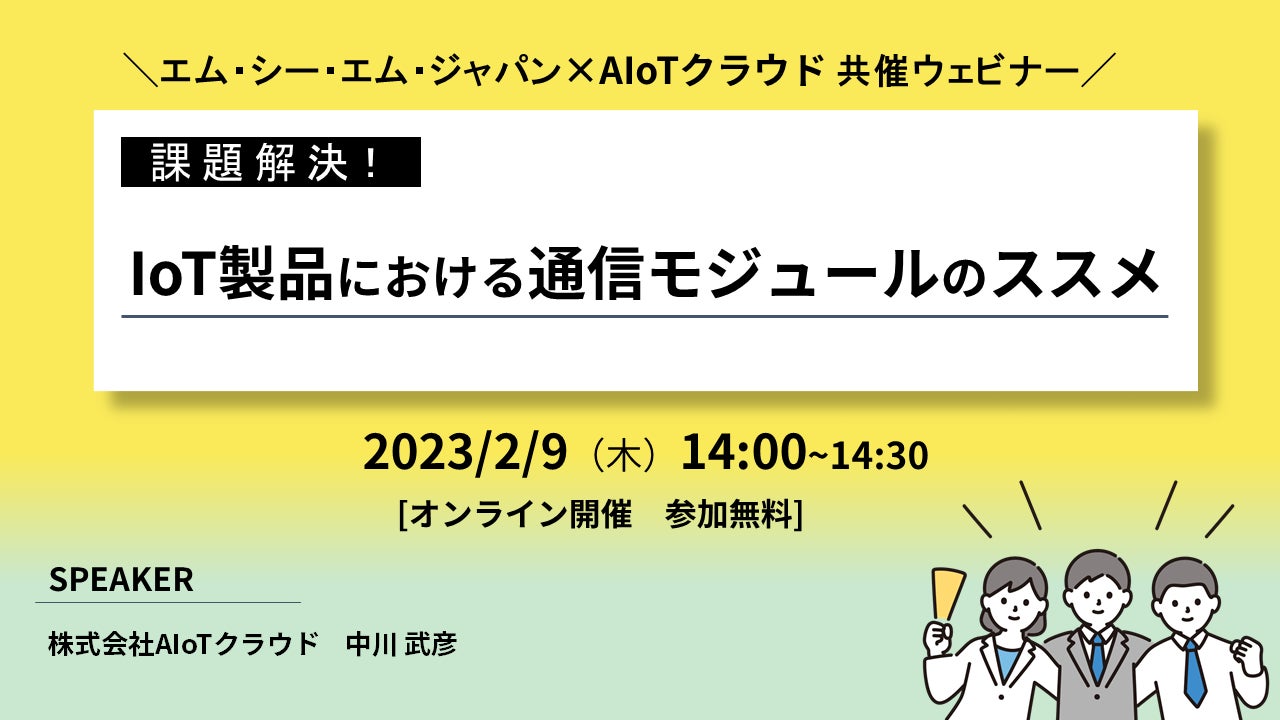 株式会社AIoTクラウド(本社:東京都江東区、代表取締役社長:石黒 豊)は、2023年2月9日(木)に、エム・シー・エム・ジャパン株式会社(本社:東京都千代田区、取締役社長:末松 緑)と共催で「IoT製品における通信モジュールのススメ」について語るウェビナーを開催することとなりましたのでご案内いたします。