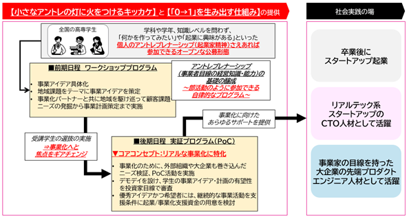 内閣府の提唱する日本が目指す未来社会の概念「Society5.0」の実現には、“デジタル技術強みを活かし新しい価値を創出できる人財”の輩出は重要なテーマであり、これらの推進に向けて、AI・数理データサイエンス、サイバーセキュリティ、ロボット、IoTといった高度な技術分野を高専教育に組み込む「COMPASS 5.0 (次世代基盤技術教育のカリキュラム化)」があります。しかし、「COMPASS 5.0」の実現には、高等専門学校が強みとするデジタル/テクノロジー知識・技術の養成に加えて、新しい価値/事業の創造に資するアントレプレナーシップの醸成も欠かせません。