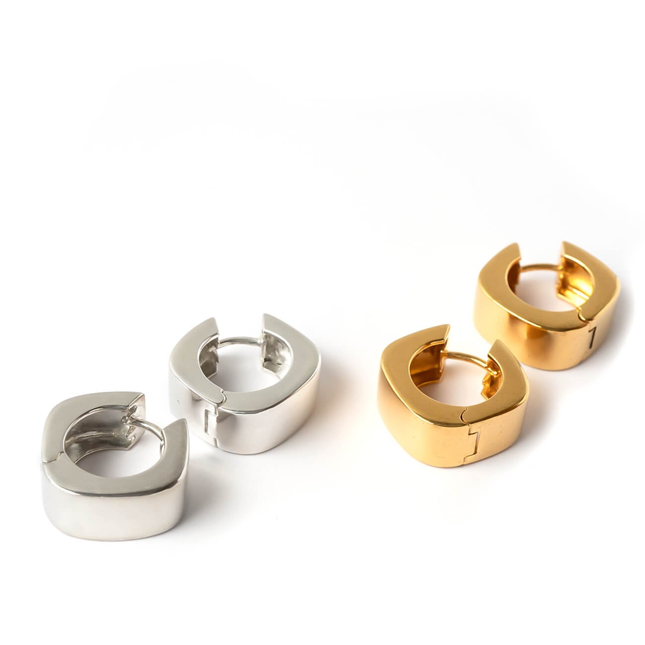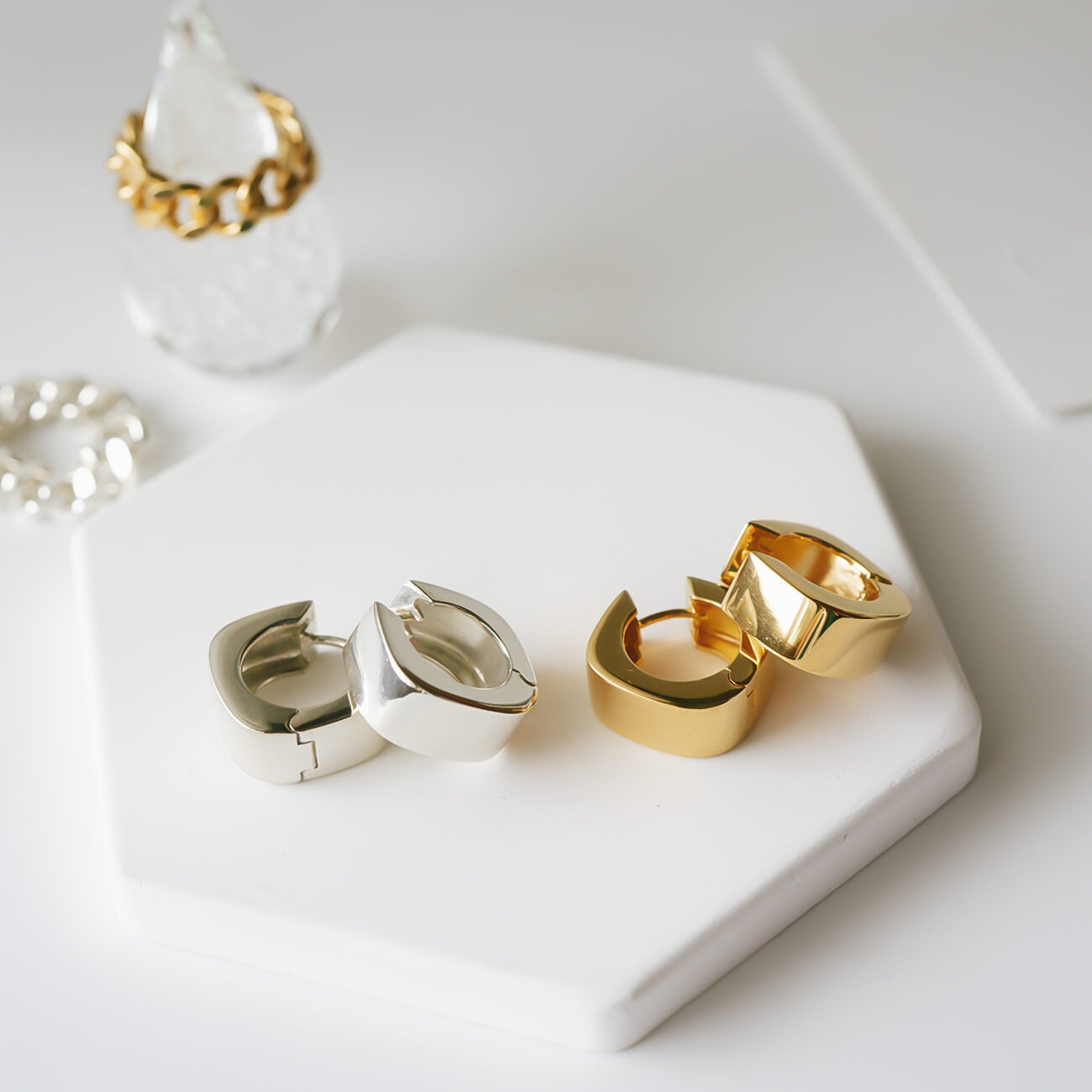しっかりボリュームのあるスクエアフープピアスは、ミニマルでモダンな雰囲気を醸し出します。厚みのあるピアスは存在感も抜群。キャッチレスで着脱しやすい中折れ式ピアスです。