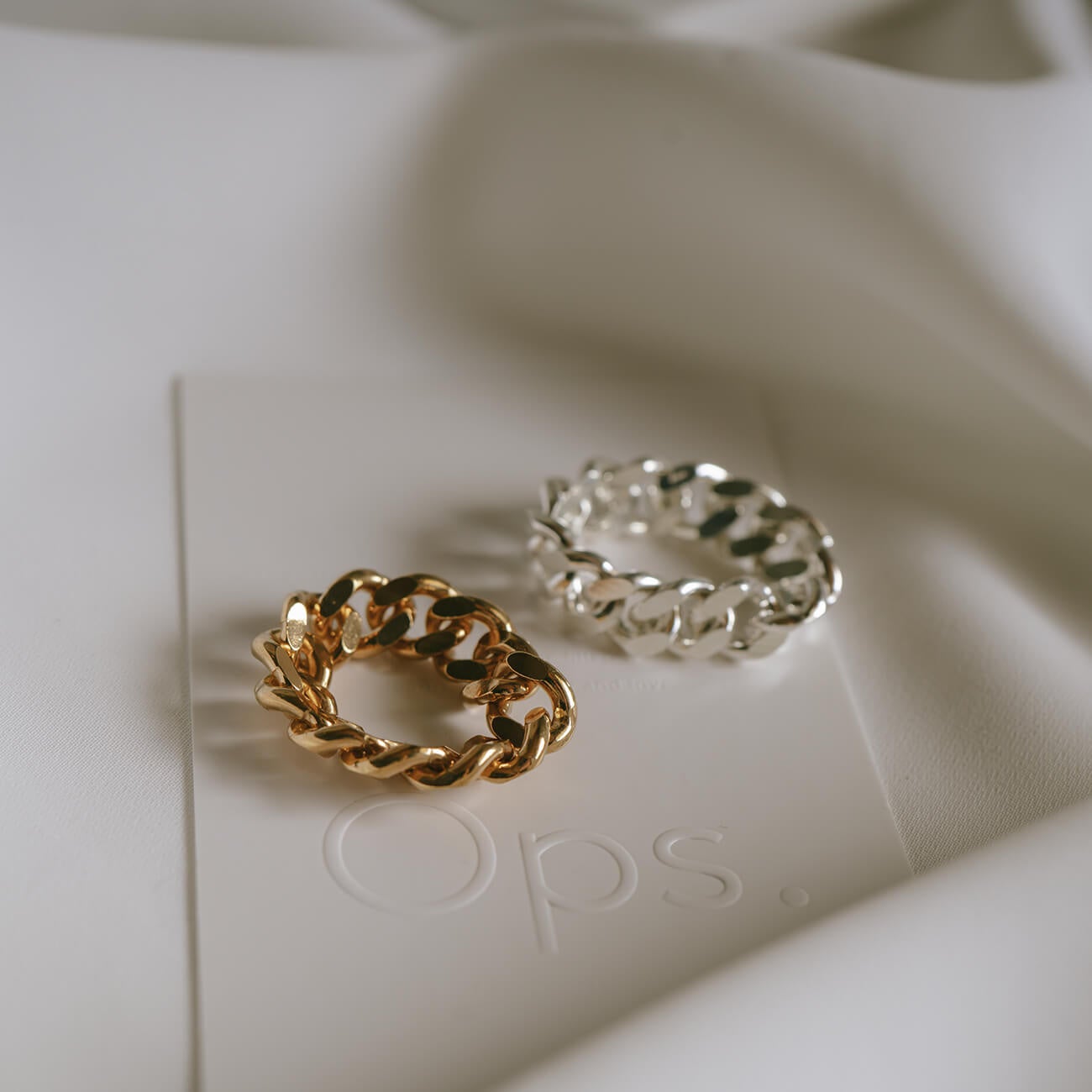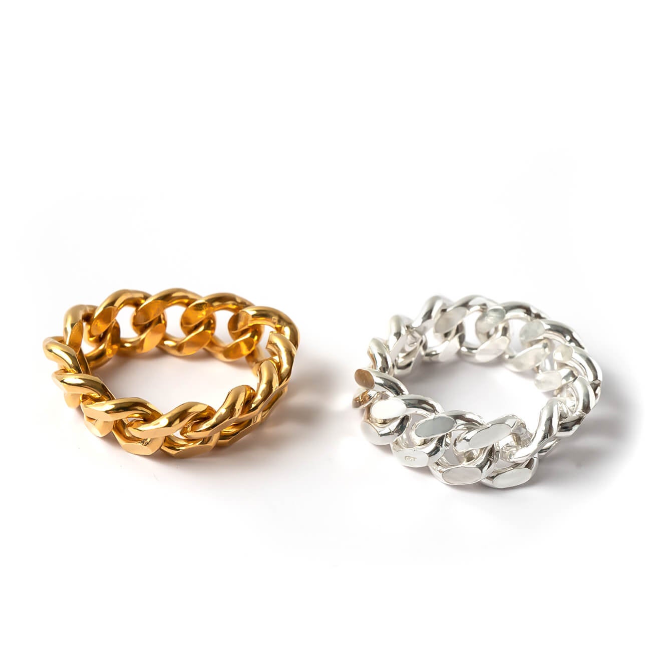 程よくゴージャスな雰囲気を纏い、コーデにパンチを効かせることができるチェーンリング。シンプル・ミニマルな装いにも適度なアピールが加わり、クールでグラマラスな印象に。