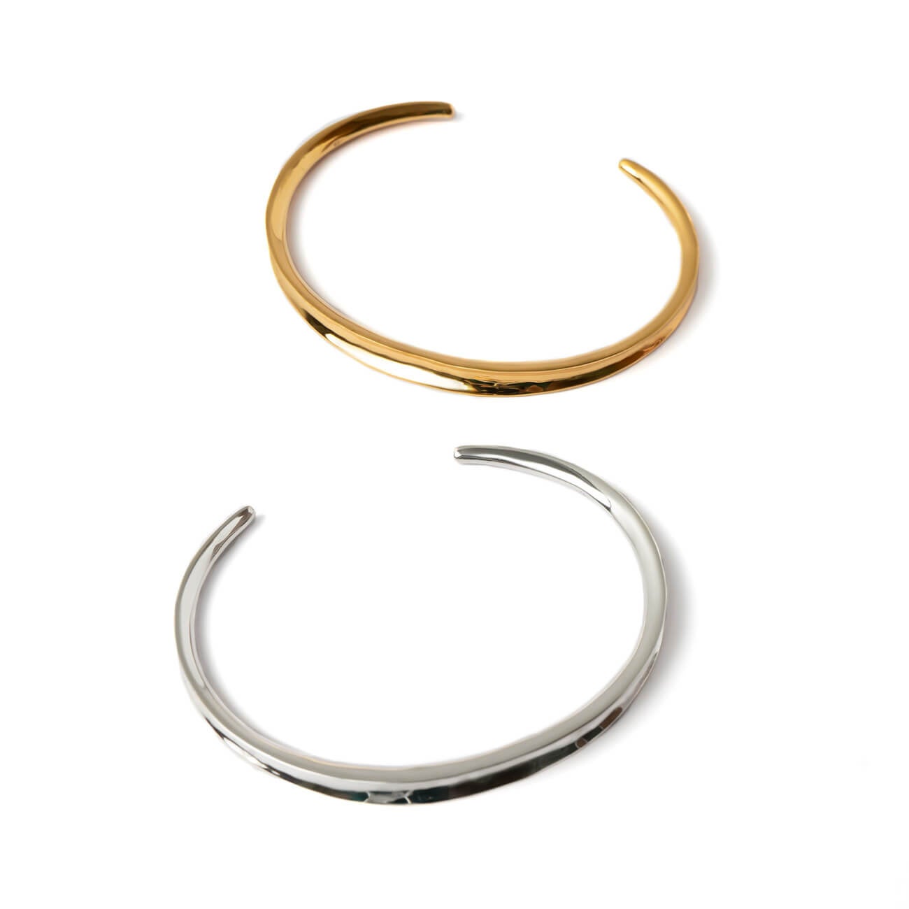 ハンドメイド感のあるカーブデザインが特徴のツヤありバングルです。余計な装飾がないクールなデザインで、ワンランク上のコーデを楽しめます。