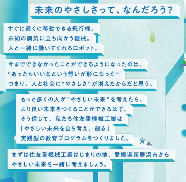暮らしが便利になるということは、人や社会を「やさしさ」で満たすことだと私たちは考えます。私たちの暮らしの「やさしさ」は、昔の人が思い描いた「あったらいいな」から生まれてきました。やさしいミライの学校は、「やさしい未来を自ら考え、創る」実践型の教育プログラムです。今、私たちが思い浮かべる未来の「あったらいいな」はなんでしょう?ワクワク・ドキドキするような「やさしい未来」を考え、つくってみましょう!