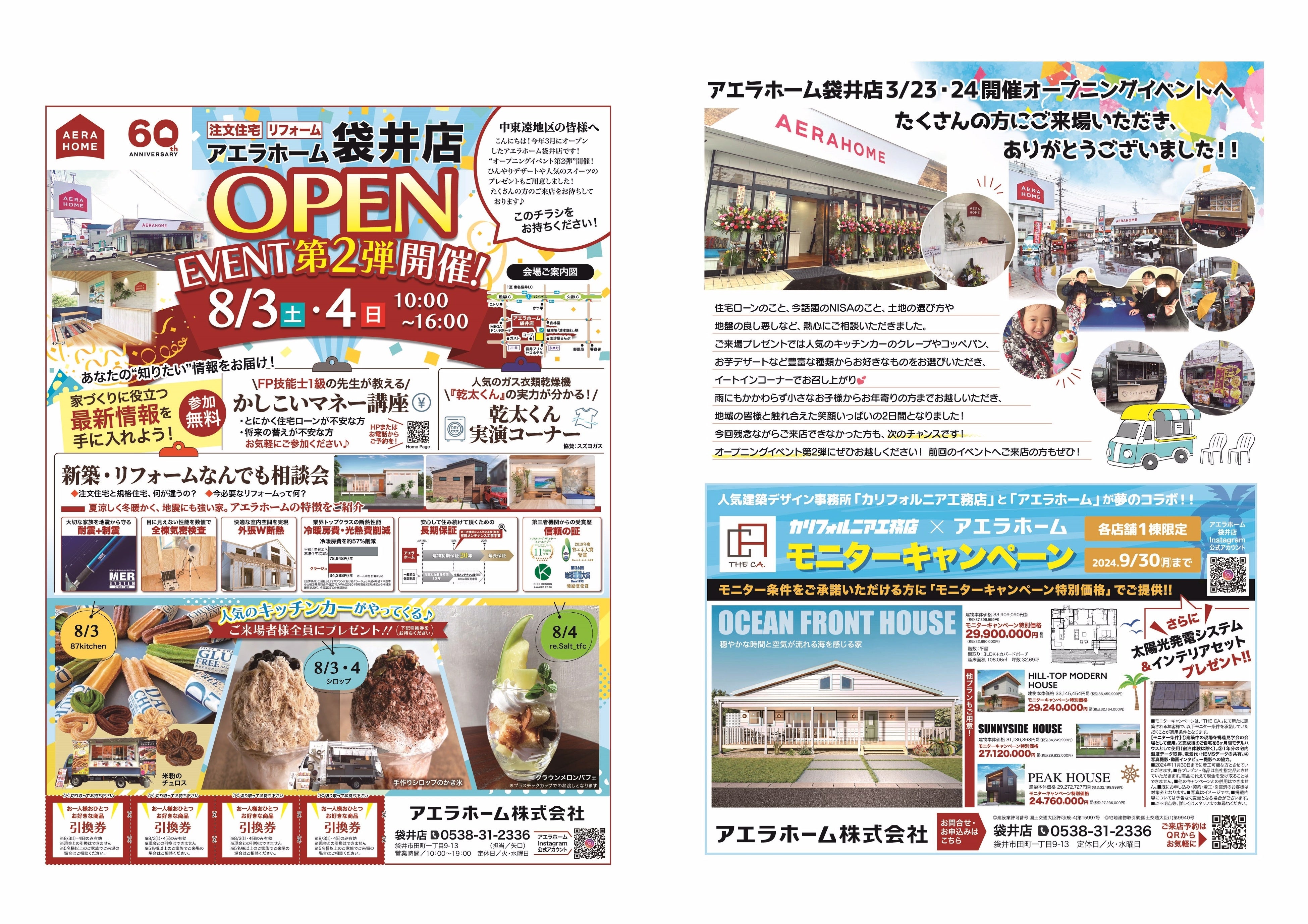 注文住宅・規格住宅の販売やフランチャイズチェーン事業(以下:FC事業)、リフォーム事業、不動産事業等を展開するアエラホーム株式会社 (以下:アエラホーム 東京都千代田区/代表取締役社長 中島秀行)は、2024年3月23日(土)にオープンしたアエラホーム袋井店(静岡県袋井市)で、8月3日(土)、4日(日)に「オープンイベント第2弾」を開催いたします。