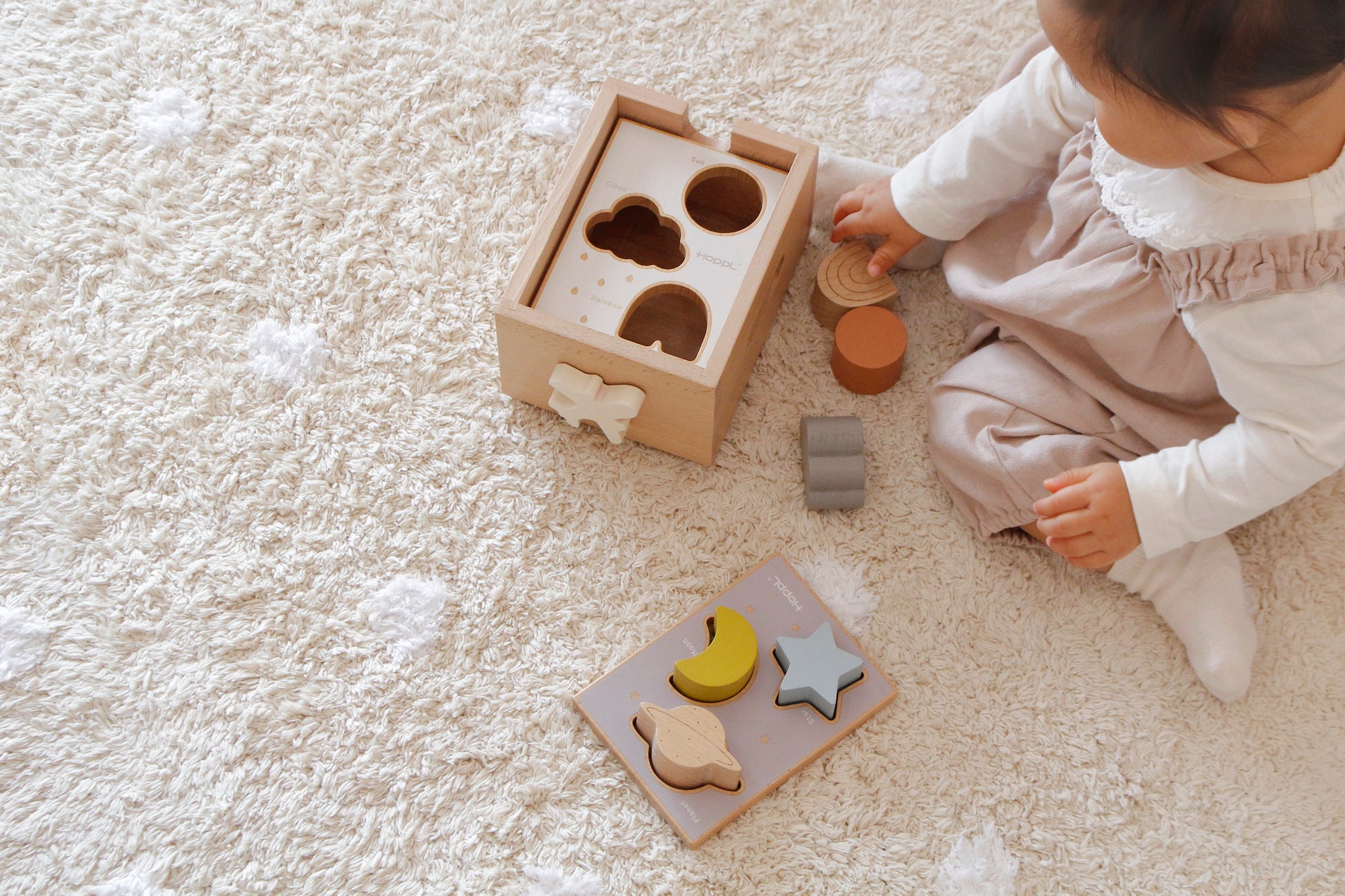 お空モチーフの2種類のプレートに空いたいろんな形の穴とぴったり合うブロックを組み合わせて遊ぶシンプルなおもちゃです。