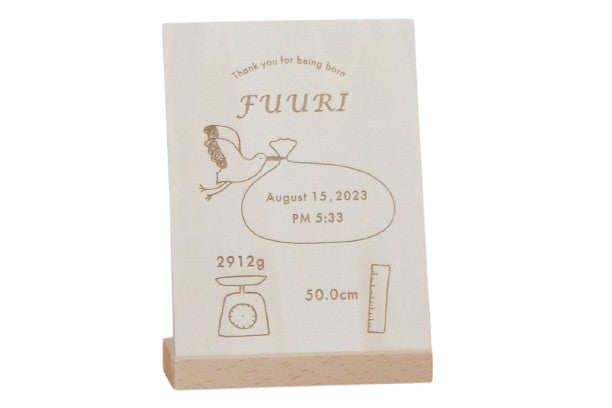 お子さまのお名前やお誕生日、出生時の身体重などを刻印できるプレートは、