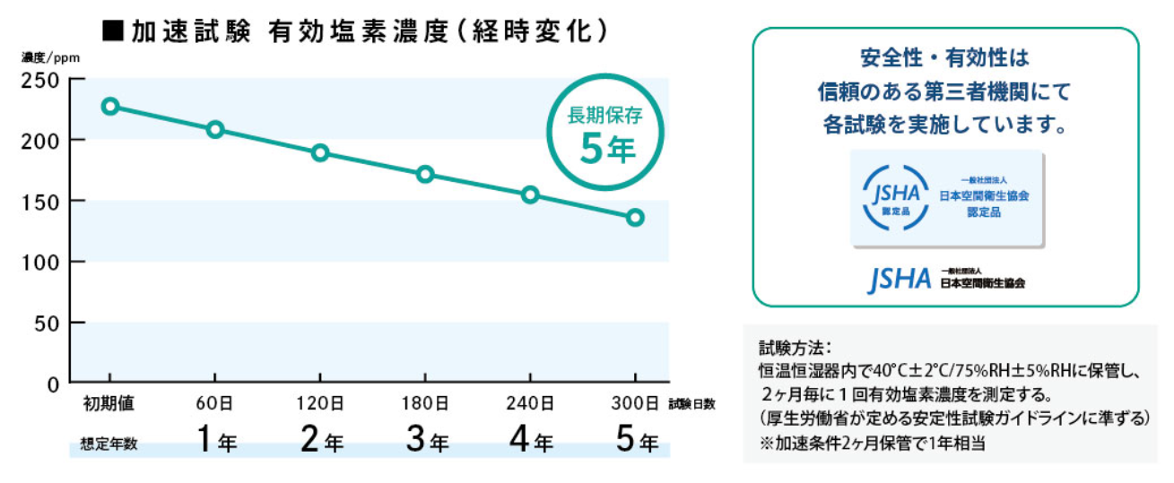 5年後の有効塩素の濃度は100ppm以上を確保しています。