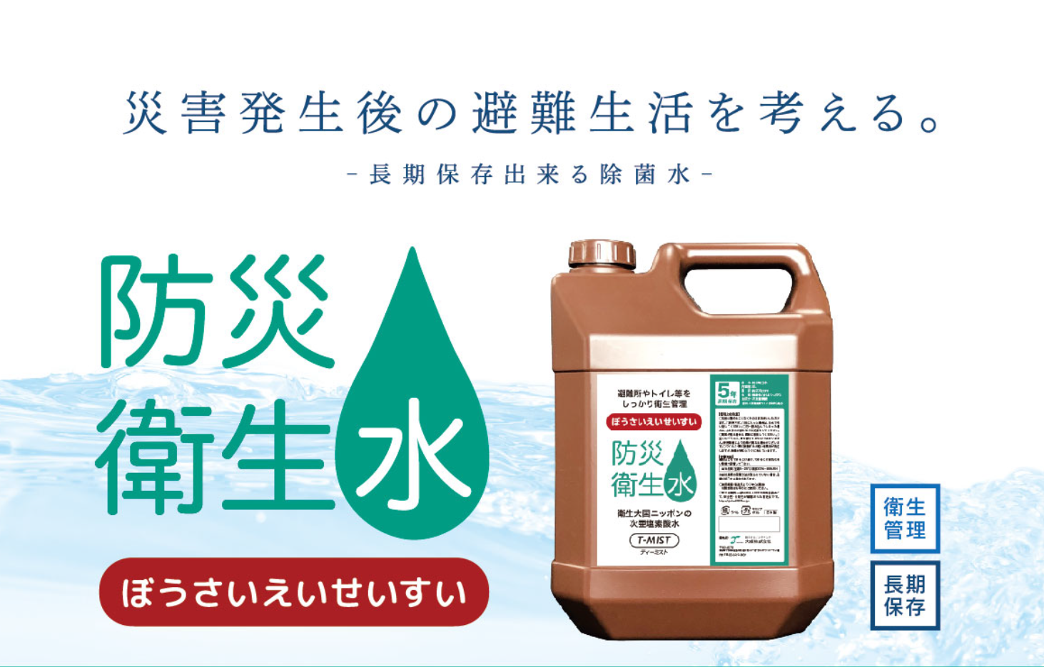 災害時の衛生対策に!“5年の長期保存が可能な防災衛生水”