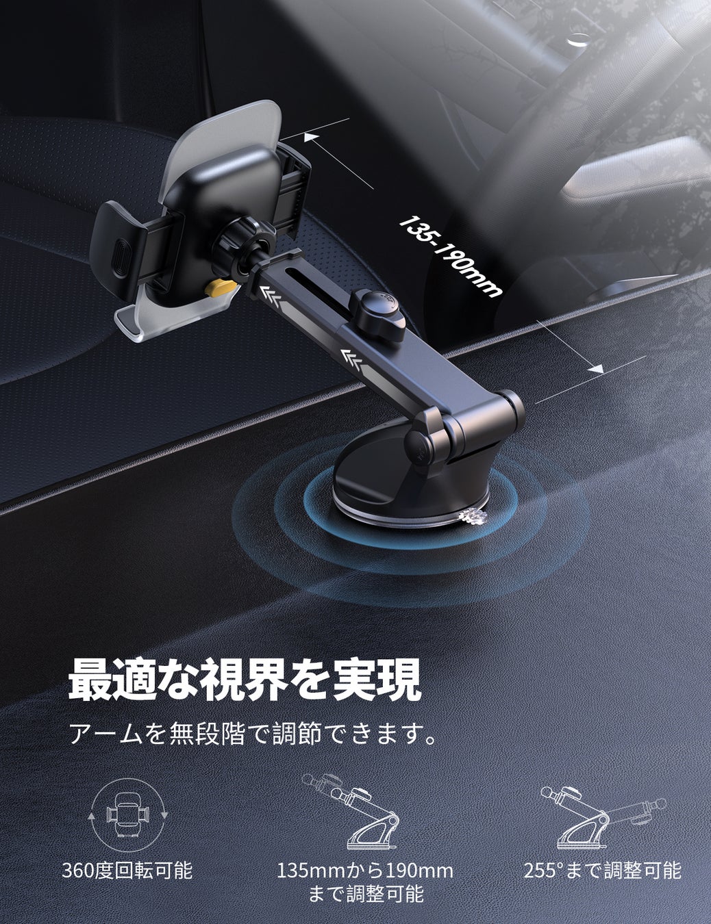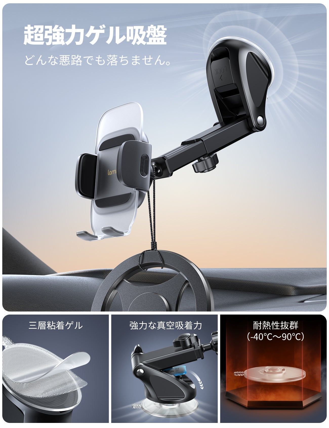 365日以上の経年変化テスト済み。超強力真空ゲル吸盤は、極寒の冬から酷暑の夏まで、ー40℃〜90℃の環境下において吸着力25kgをキープします。ほとんどの車のダッシュボードに対応しており、お住まいの地域の気候にも負けない優れた耐冷性・耐熱性を発揮します。