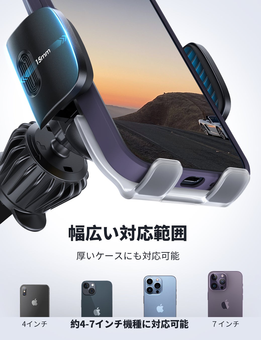 Lamicallのスマホホルダーのフックはプラスチックではなく金属製。ホールド力も抜群です。クリップはスマホのサイドボタンに触れない設計で、誤操作を防げます。また、充電部分をふさがない構造なので、走行中にスマホを充電しながら使用できる点も特徴です。Lamicallではかねてより車載用スマホホルダーを販売しておりますが、今回の製品は安全性とデザイン性がさらにアップグレードされました。